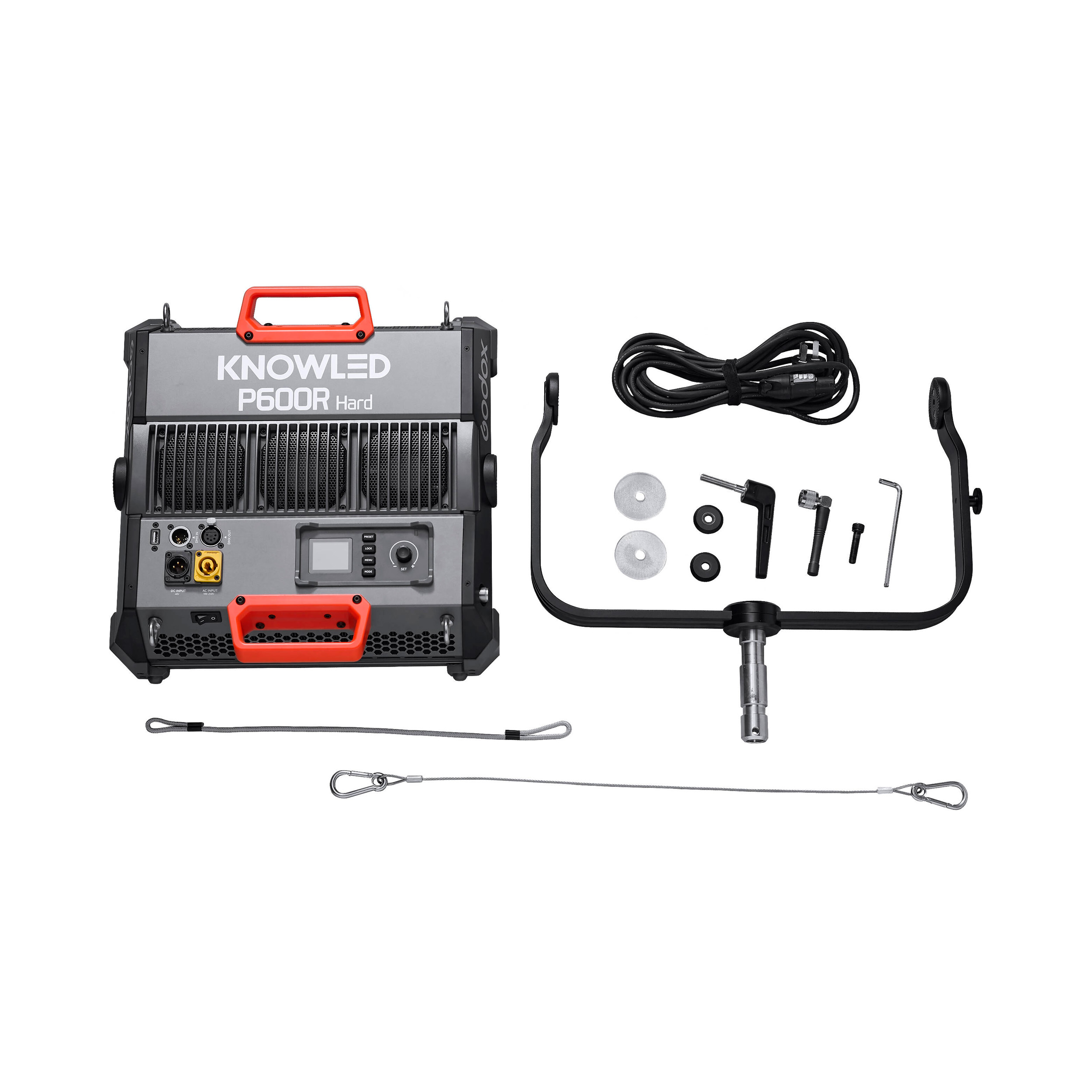 Осветитель поставляется с U-образным монтажным кронштейном, кабелем питания переменного тока, страховочным тросом, шайбами, винтом и рукояткой регулировки положения прибора, а также шестигранным ключом для затяжки соединений кронштейнов и таблицей DMX.