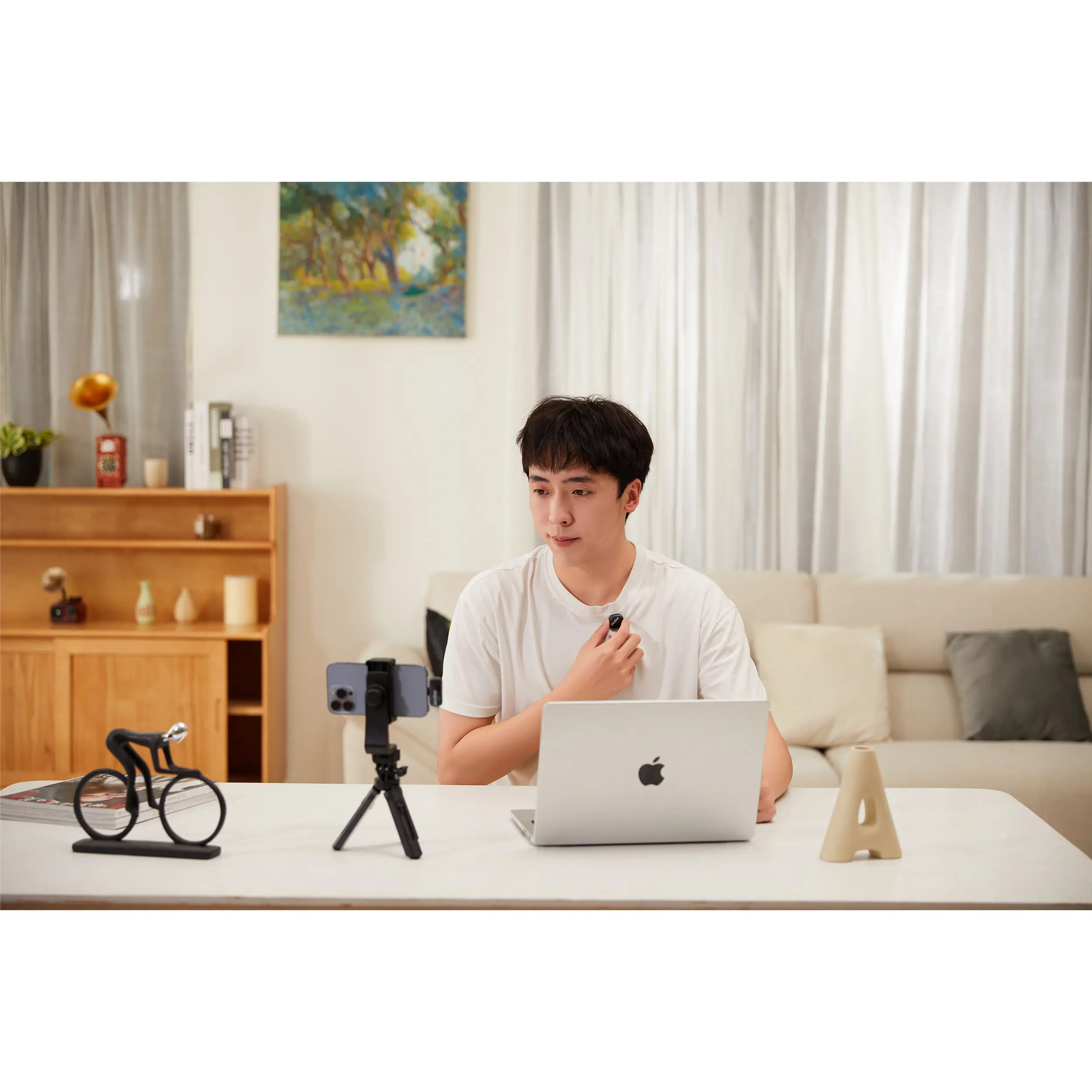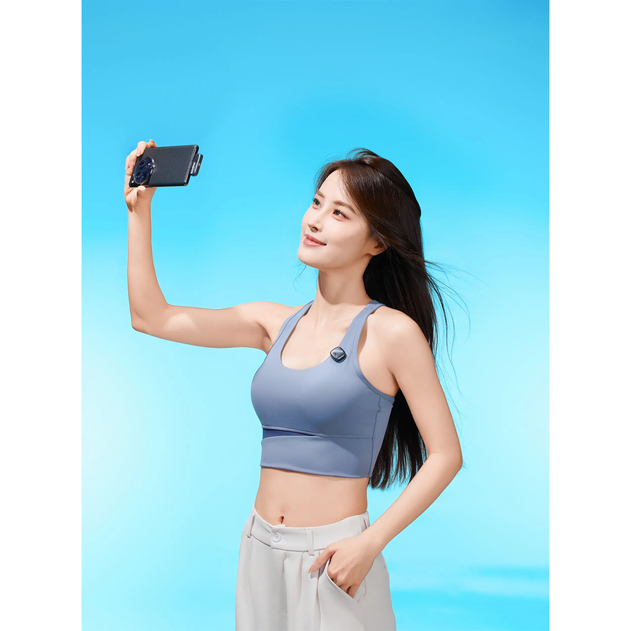 Передатчик также служит пультом дистанционного управления, позволяя запускать запись или делать снимки на телефоне с расстояния до 50 метров. Дистанционный запуск съемки активируется двойным нажатием кнопки на передатчике при открытом интерфейсе камеры на смартфоне.
