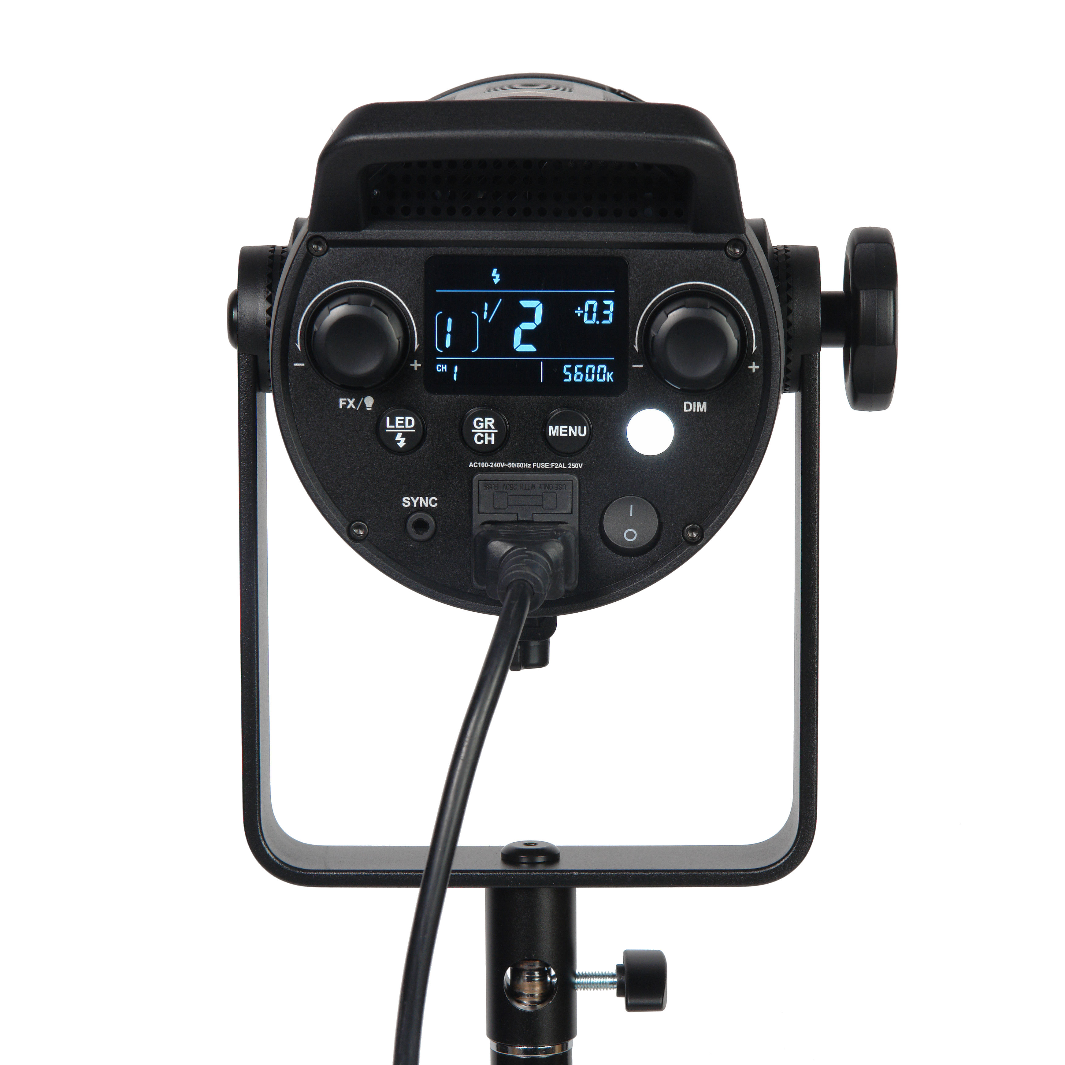 С тыльной стороны осветителя расположена панель управления с цифровым ЖК-дисплеем. На панели находятся два регулятора, использующиеся также как кнопки, 4 кнопки переключения режимов, тумблер питания и синхроразъем. Там же на панели расположен сетевой разъем для крепления кабеля питания с длиной шнура 5 м. На контрастном черно-белом (белые символы на черном фоне) ЖК-дисплее размером 50х35 мм отображаются выбранные режимы и установленные значения.