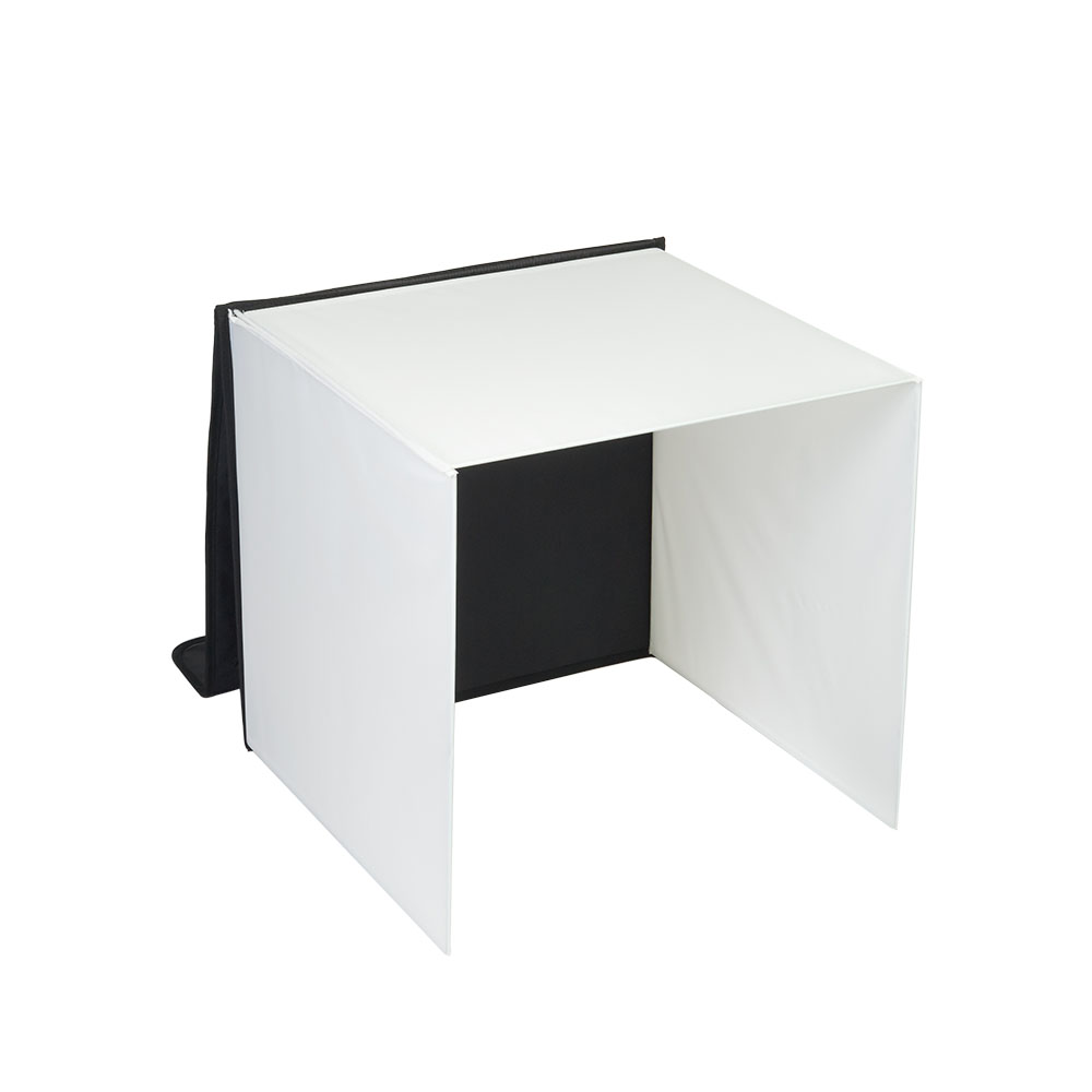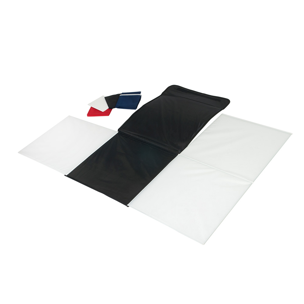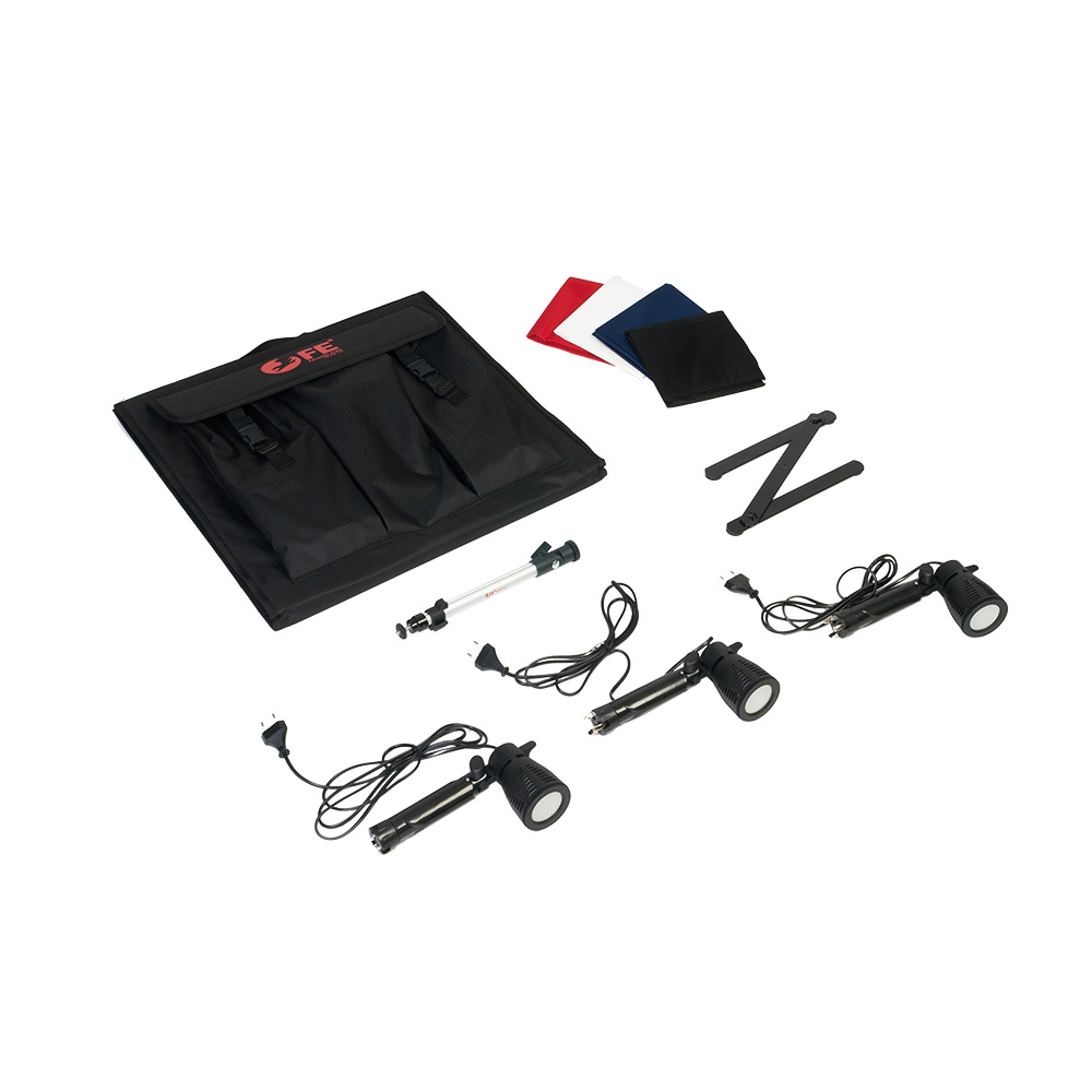 Матовые полупрозрачные стенки дают возможность бестеневого освещения объекта, а одновременное использование трех источников постоянного света позволяет правильно выстроить светотеневой рисунок. Благодаря своей конструкции, софтбокс быстро подготавливается к работе, ткань стенок остается ровной. В комплект входит 4 фона – черный, красный, синий и белый. Осветители со светодиодными лампами формируют яркий световой поток с цветовой температурой 5400К.