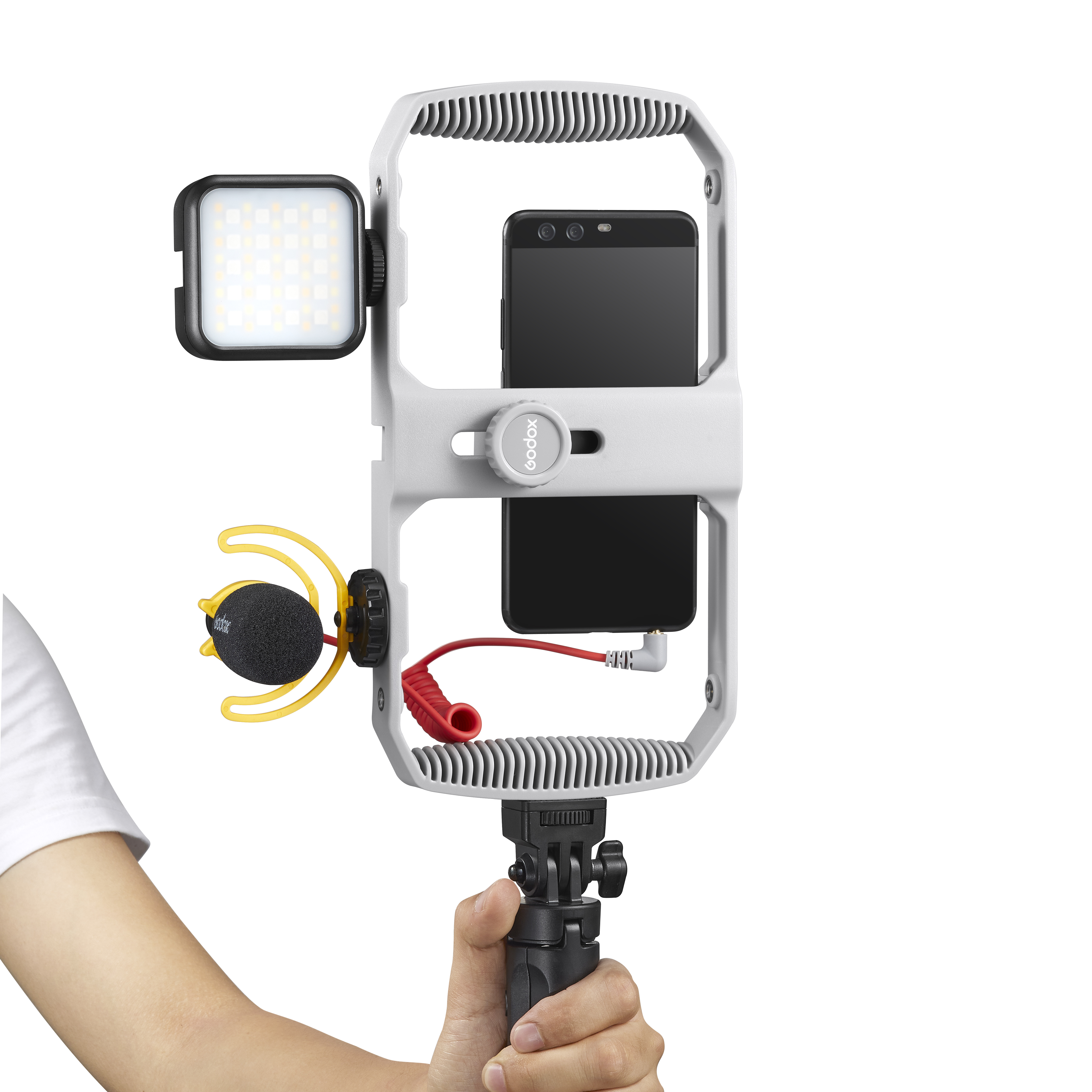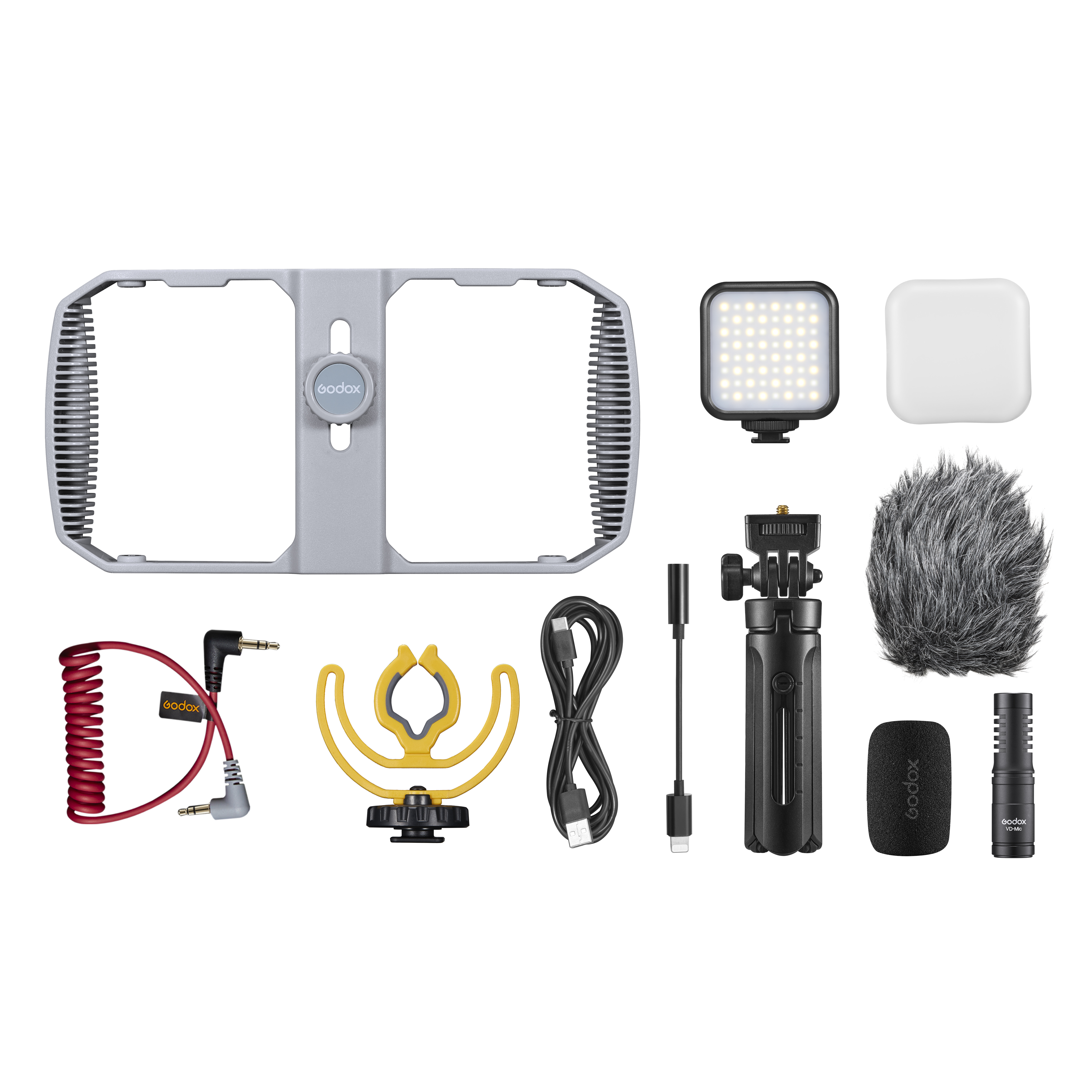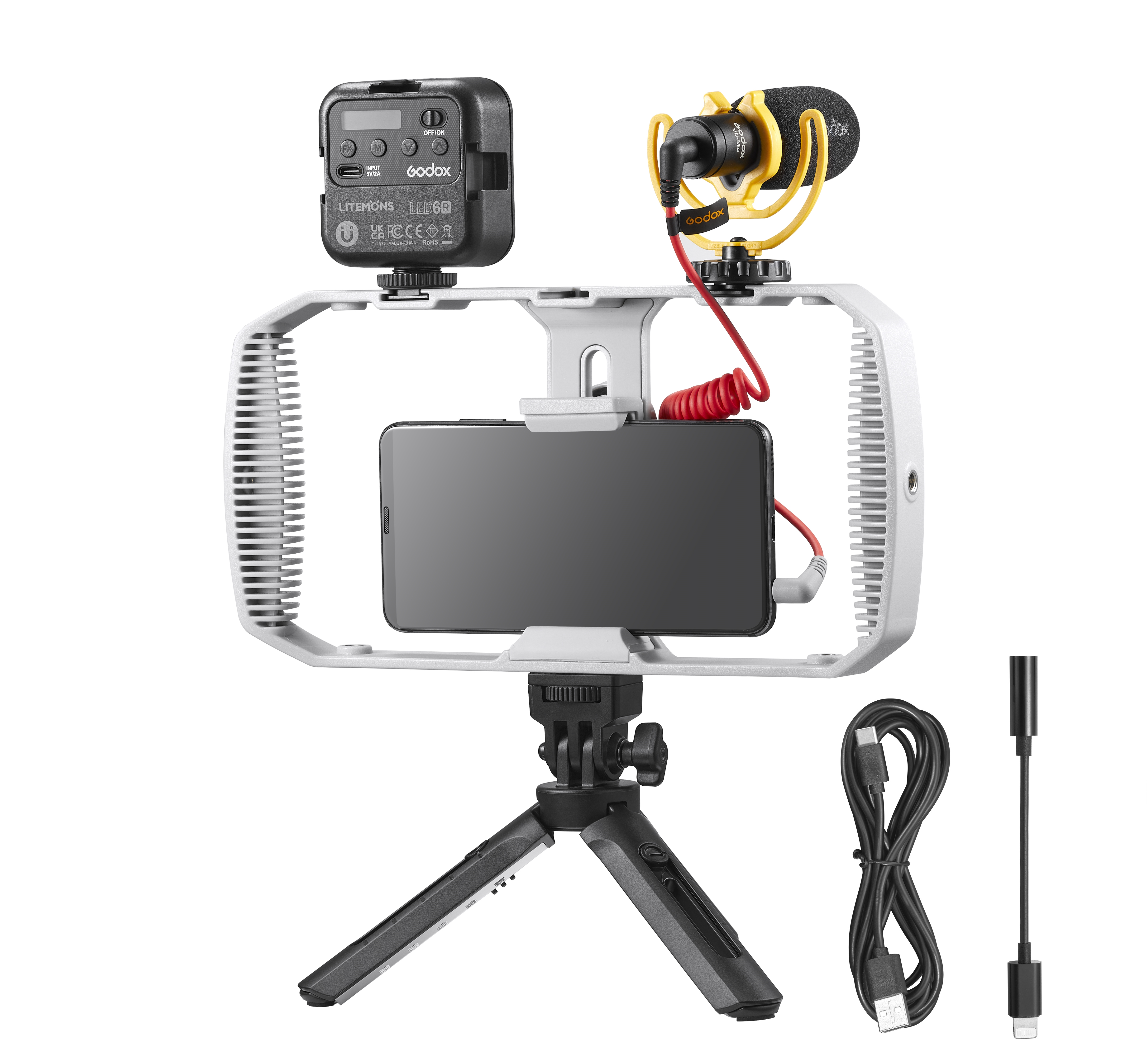 Комплект оборудования Godox VK1-LT собрал все самое необходимое для повышения качества звука и изображения при записи на смартфон. В комплект VK1 входят светодиодный осветитель Godox LITEMONS LED6R RGB, накамерный микрофон-пушка Godox VD-Mic, складной штатив Godox MT01, клетка (риг) Godox VSS-R01.