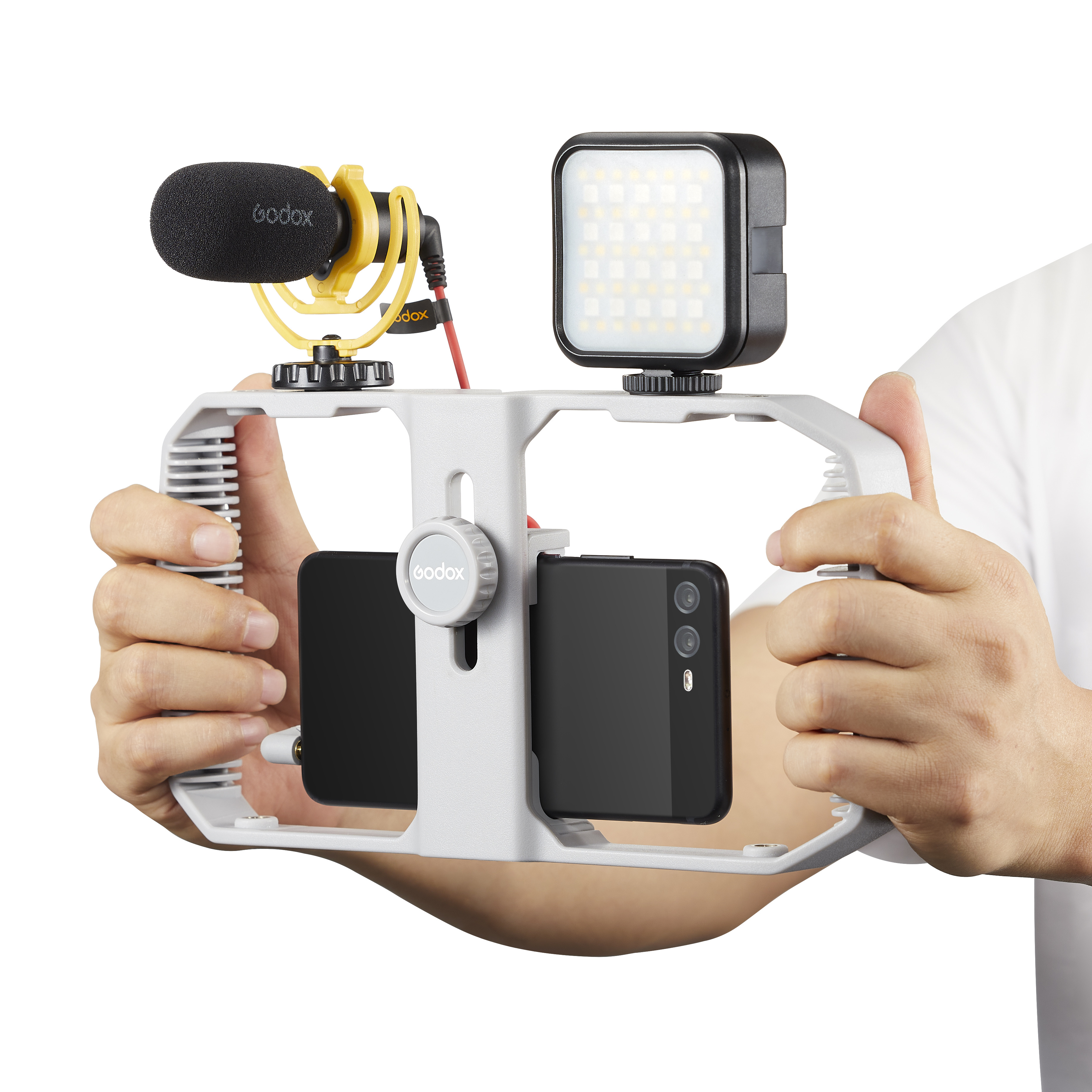 Комплектные осветитель Godox LITEMONS LED6R и накамерный микрофон-пушка Godox VD-Mic, а также любые другие дополнительные устройства устанавливаются в три крепления «холодный башмак», расположенных на одной из сторон клетки. Например, можно закрепить еще один смартфон, осветители, микрофон или другие устройства.
