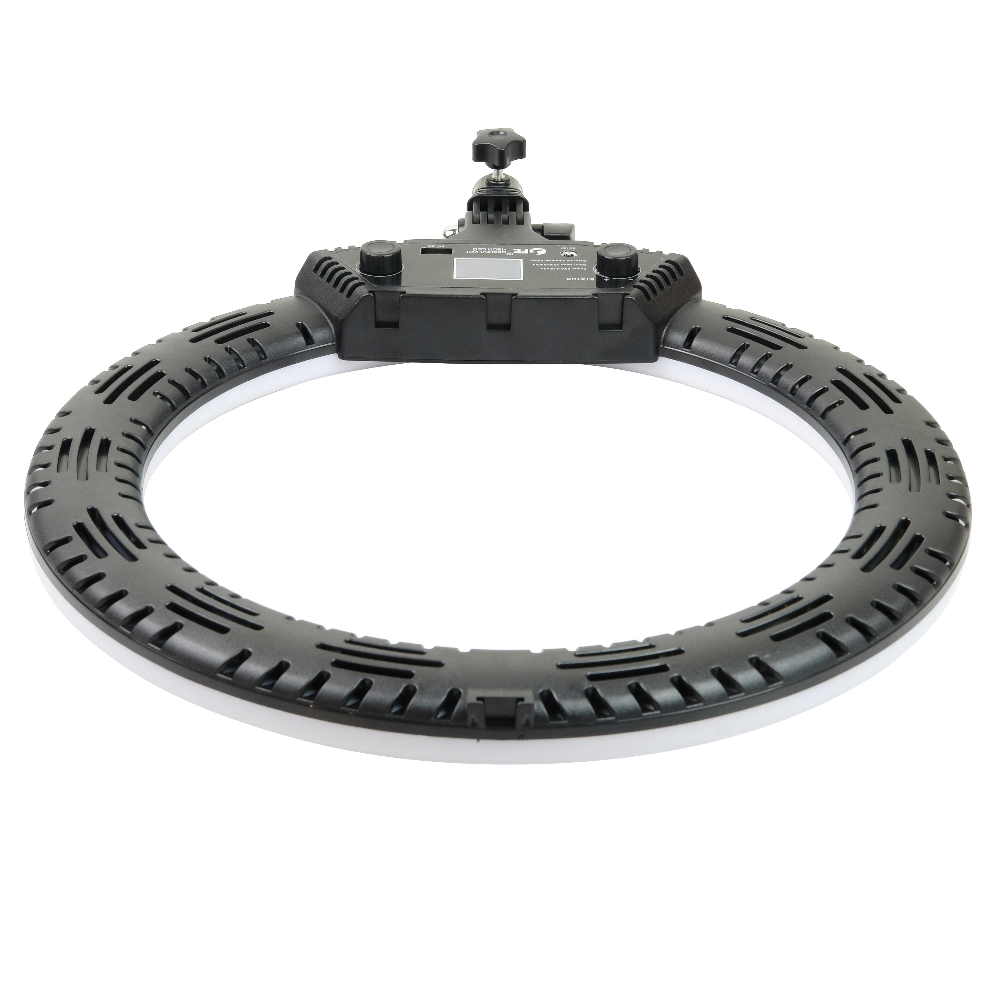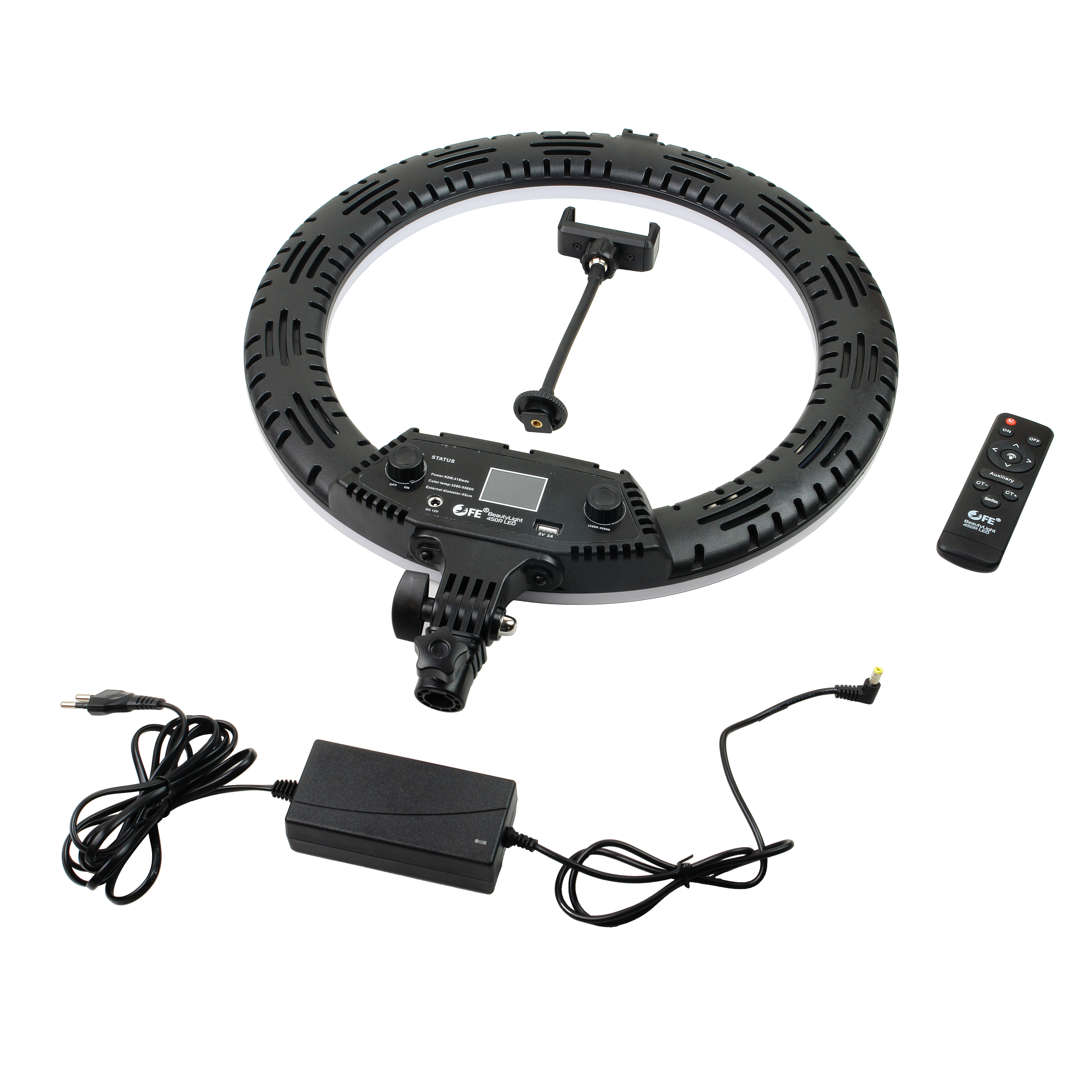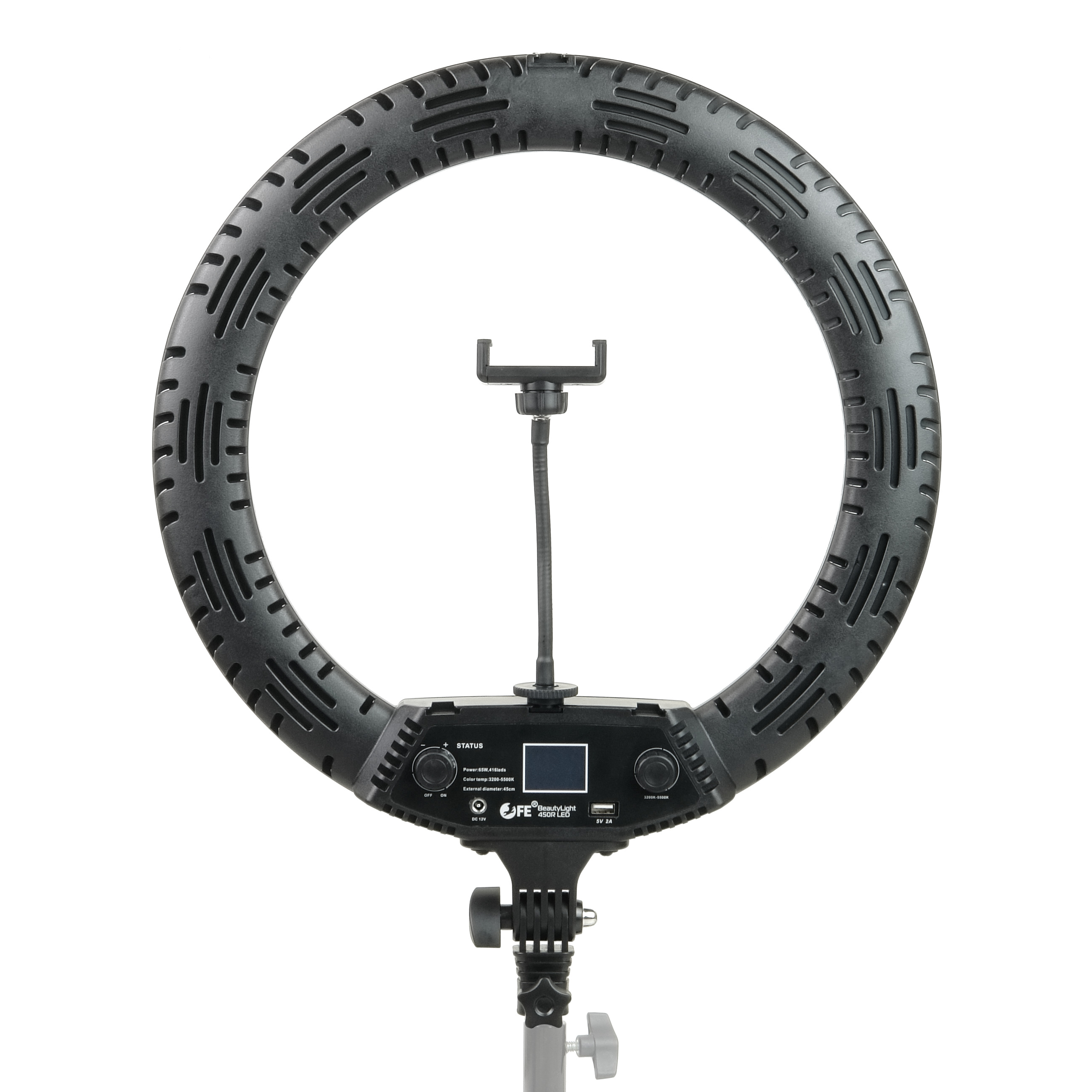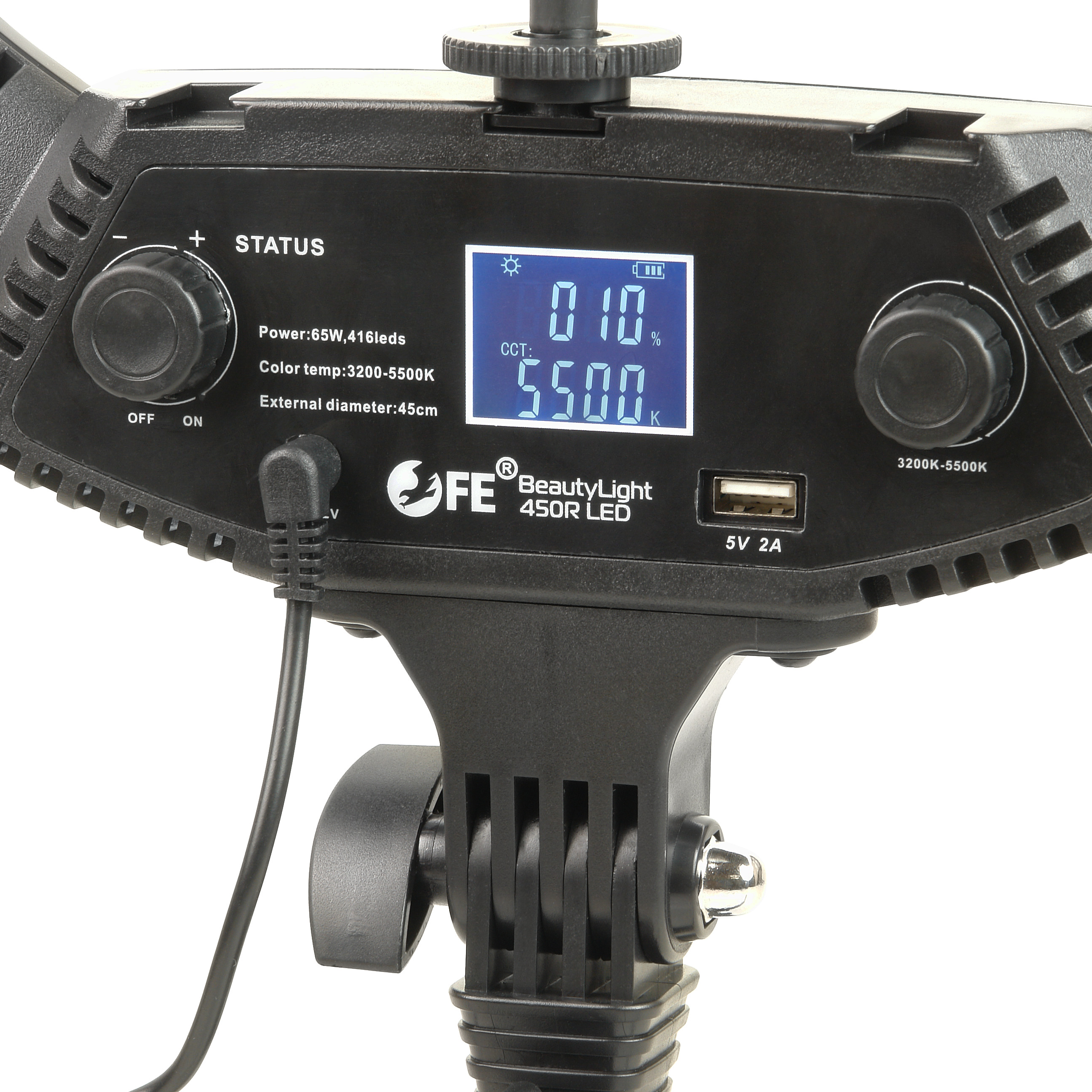 Falcon Eyes BeautyLight 450R LED – компактный биколорный кольцевой осветитель Ø45 см, на световой панели которого расположено 416 светодиодов «теплого» и «холодного» света, с плавно регулируемой цветовой температурой и мощностью светового потока от 10 до 100% (65 Вт).