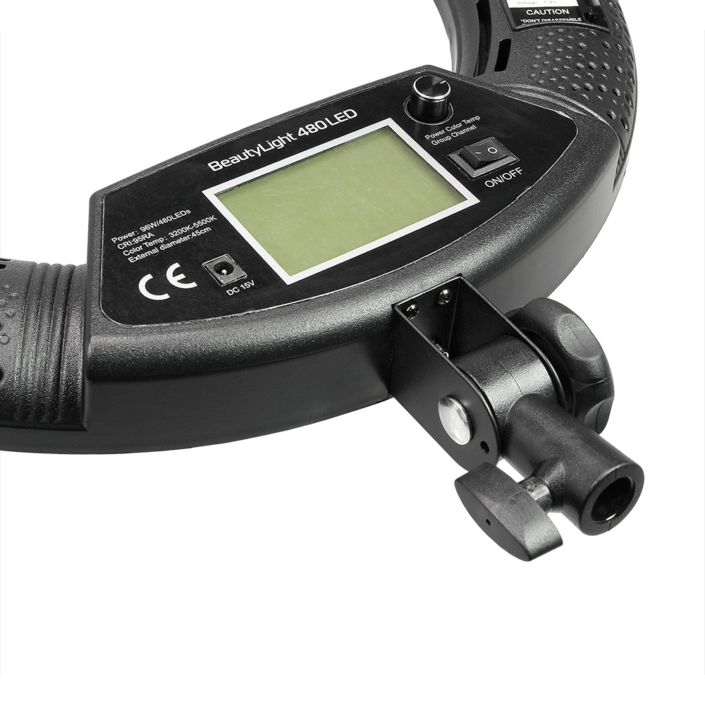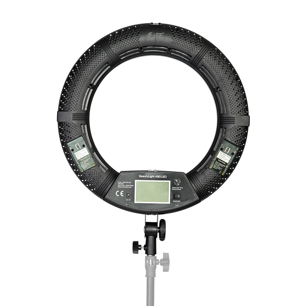 Светодиодный осветитель BeautyLight 480 LED представляет собой легкий и компактный осветитель с источником света в виде кольцевой панели диаметром 45 сантиметров с 480 светодиодами мощностью 96 Вт. Благодаря такой форме свет распределяется равномерно, освещая скрытые тенью участки.
