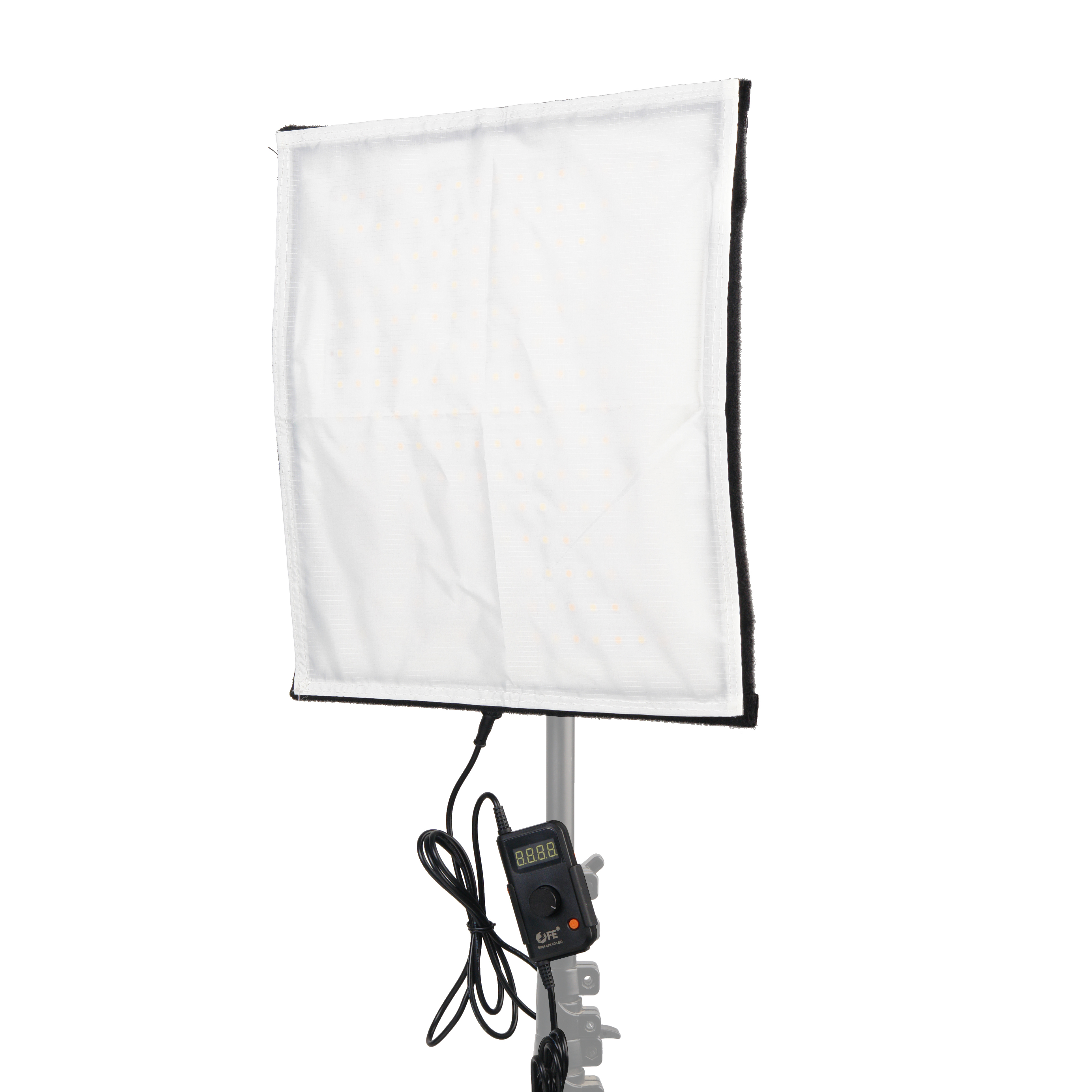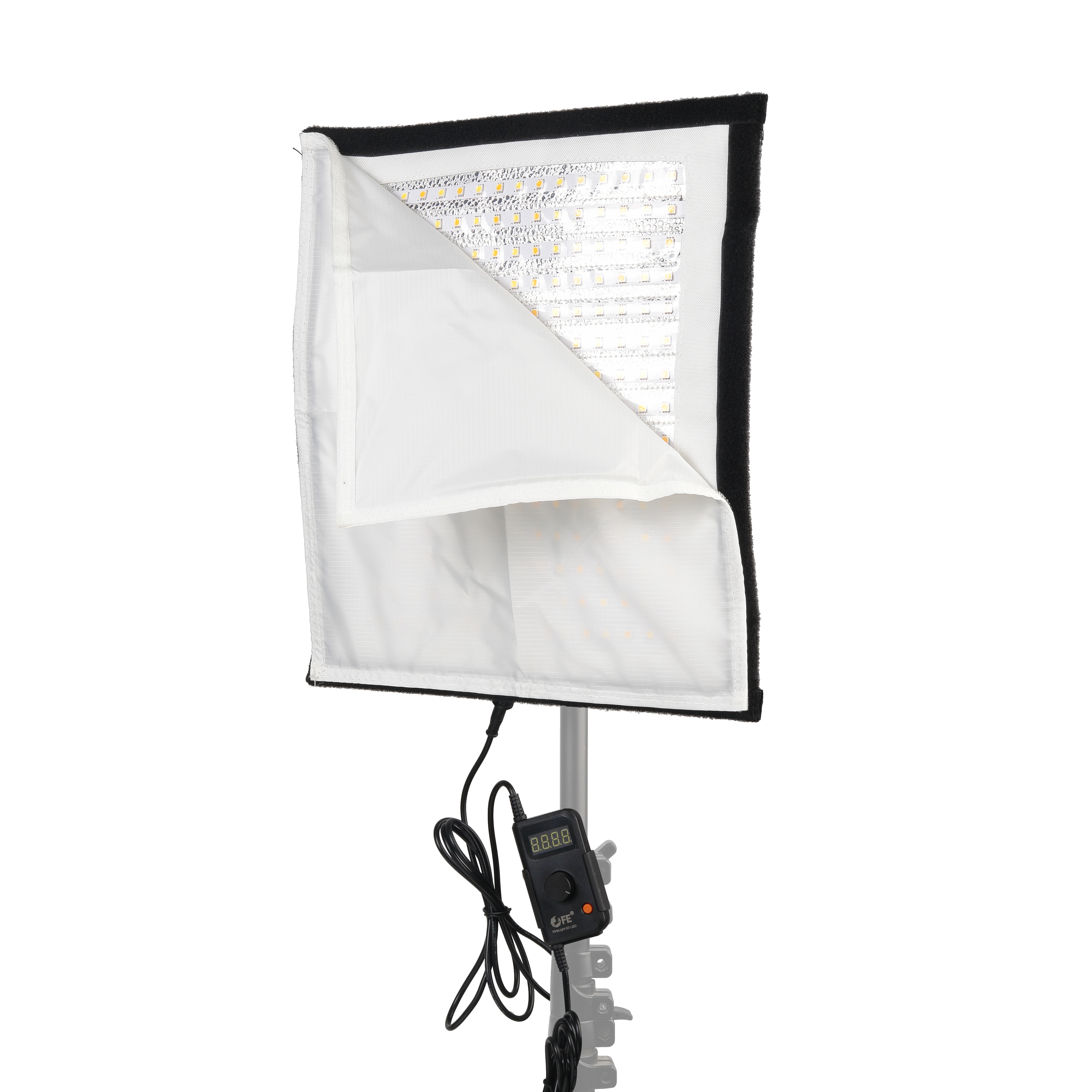 Для получения мягкого светового потока в комплект входит тканевый светорассеиватель из полупрозрачного полиэстера. Крепление рассеивателя производится с помощью липучки к лицевой стороне панели. На обратной стороне светодиодной панели также размещена липучка, на которую можно прикрепить контроллер и сетевой адаптер при помощи комплектных лент-липучек.