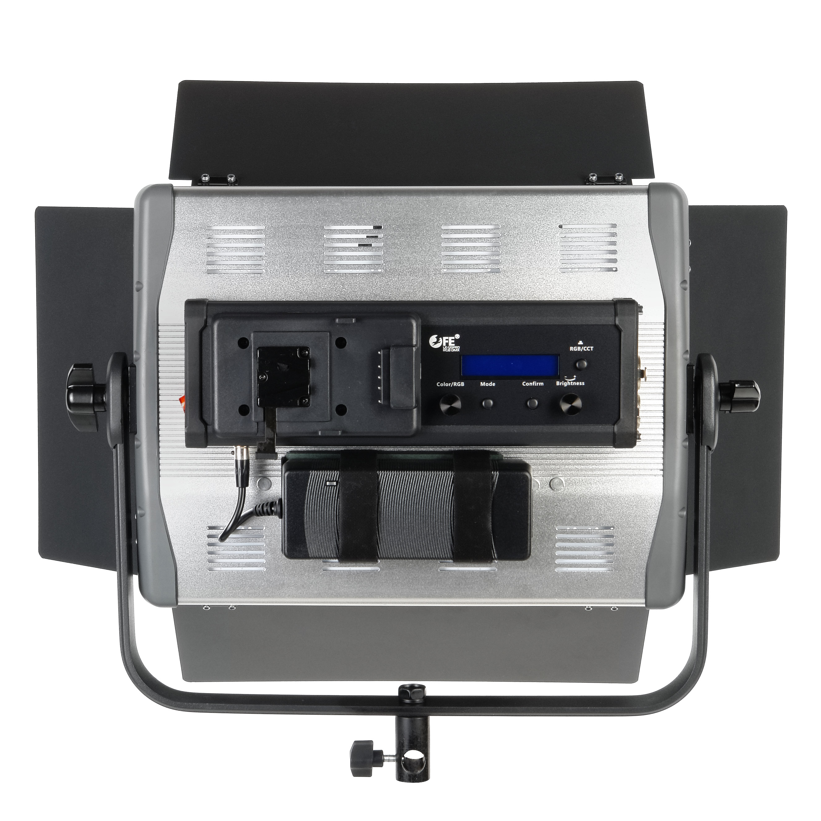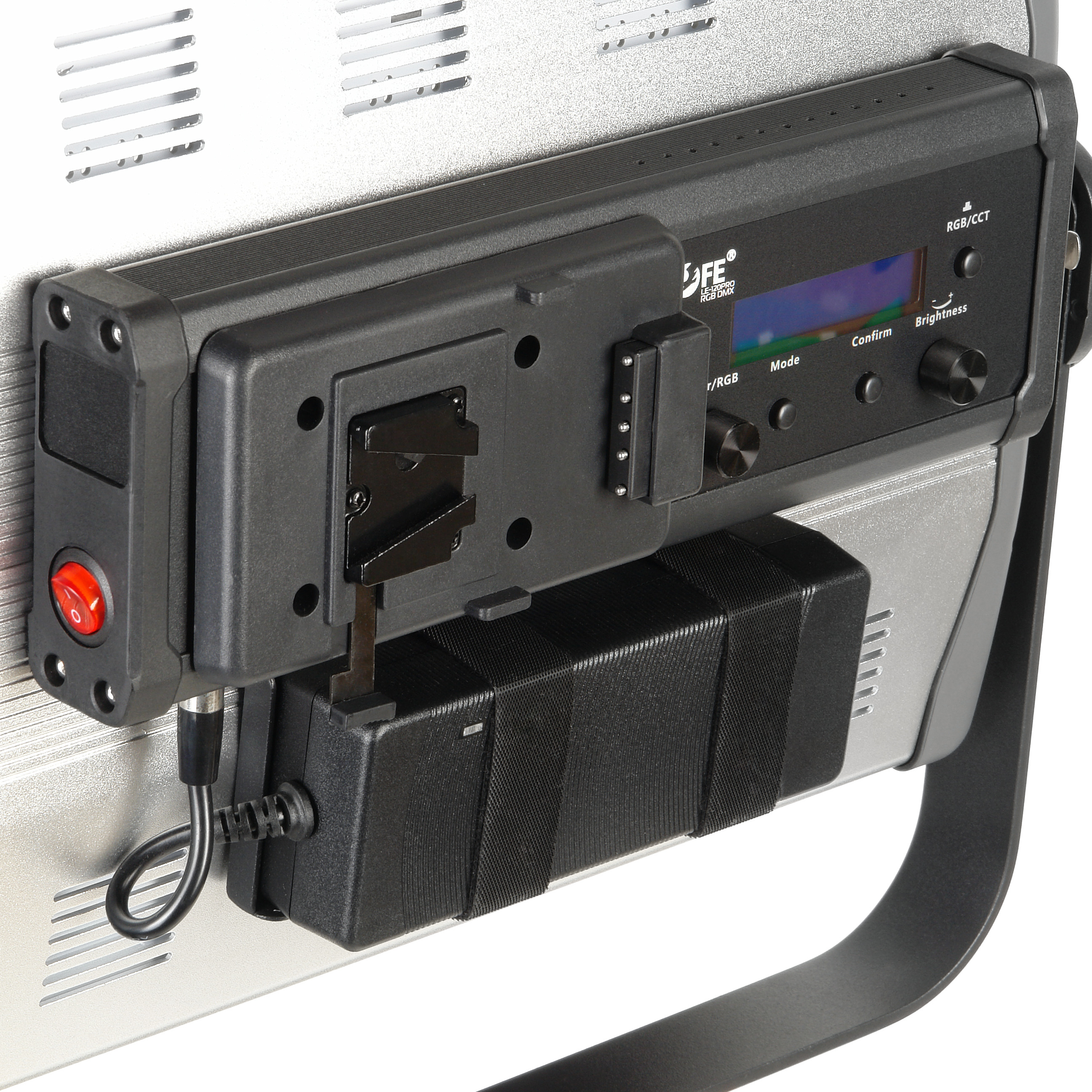 Осветитель питается при помощи комплектного адаптера от сети 220В. Можно организовать автономное питание от съемного аккумулятора V-mount (приобретается дополнительно). Для этого на тыльной стороне осветителя предусмотрена аккумуляторная площадка.