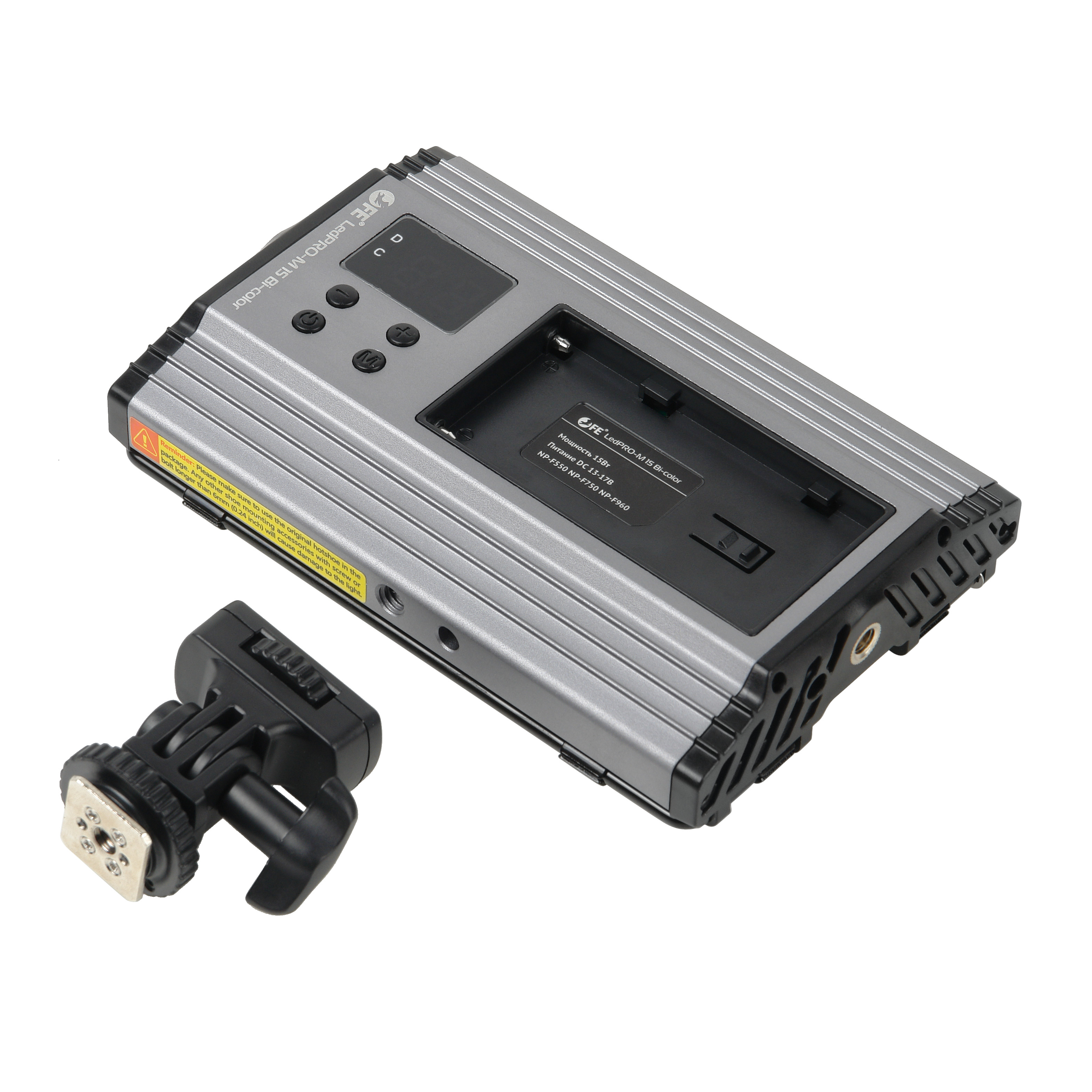 LedPRO-M 15 Bi-color предусматривает два типа питания – от съемной аккумуляторной батареи NP-F или от внешнего сетевого адаптера DC 2.1х5.5 (аккумуляторы и сетевой адаптер приобретаются отдельно).