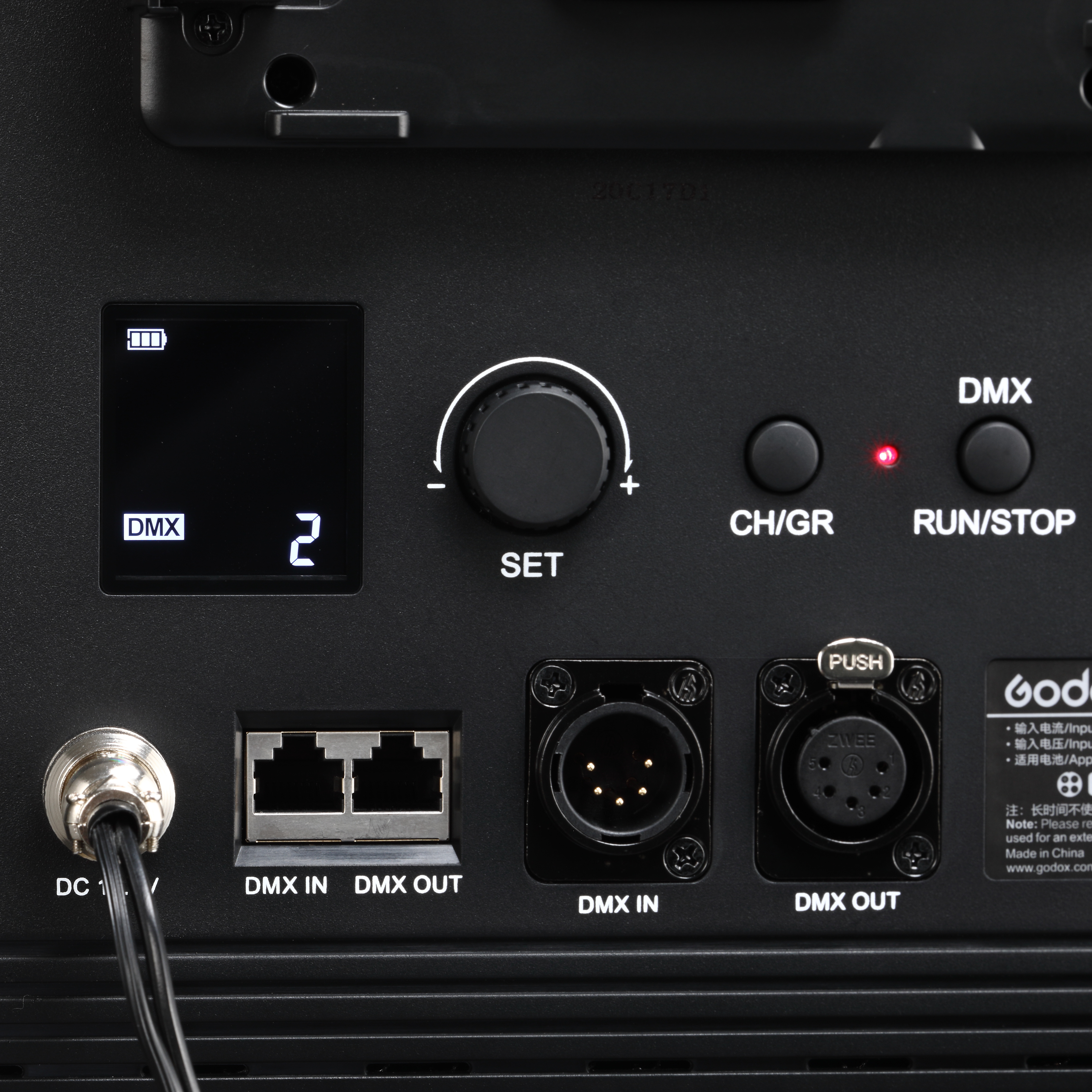 На задней панели осветителя расположен отсек для установки аккумуляторной батареи серии BP-L (V-mount, батарея приобретается отдельно). Индикатор заряда батареи отображается на ЖК дисплее осветителя. В условиях студийной съемки осветитель можно подключить к сети 220В с помощью входящего в комплект сетевого адаптера.