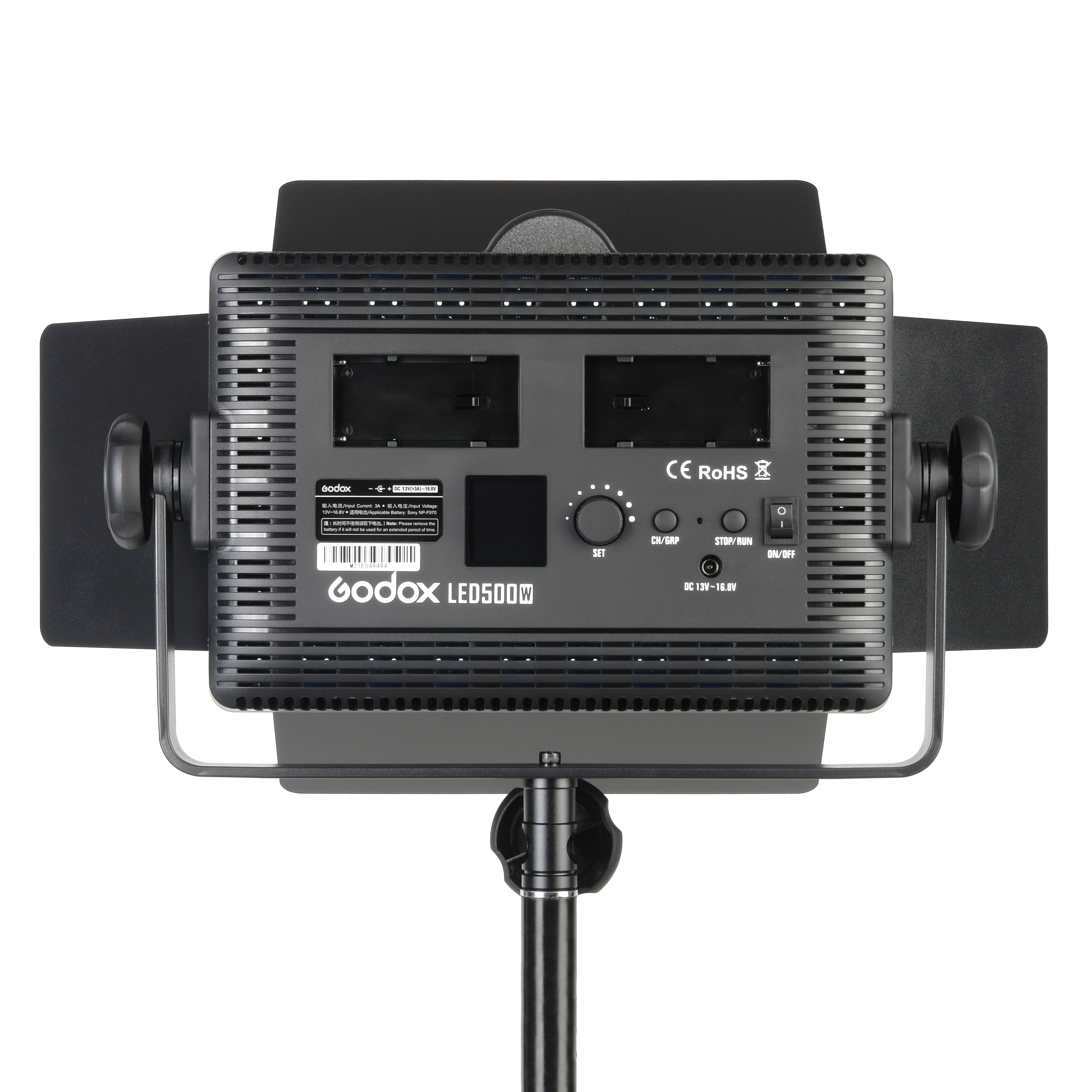 На задней панели осветителя расположены 2 отсека для установки аккумуляторных батарей серии NP-F (батареи приобретаются отдельно). Индикатор заряда батареи отображается на ЖК дисплее осветителя. В условиях студийной съемки осветитель можно подключить к сети 220В с помощью входящего в комплект сетевого адаптера.