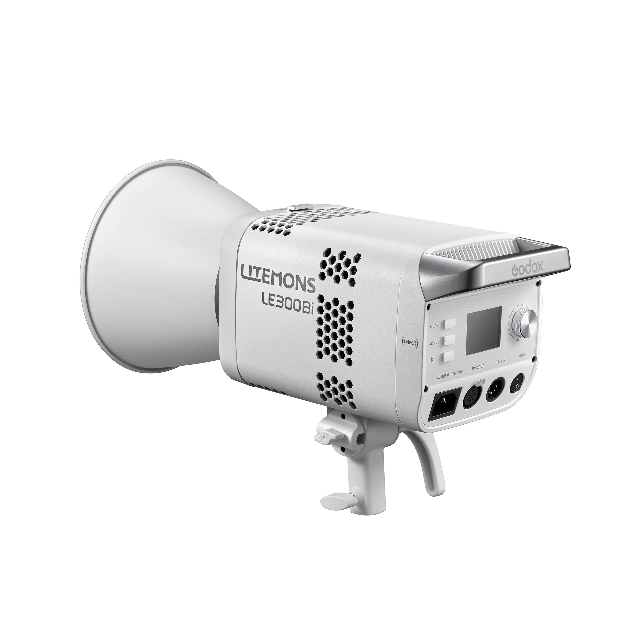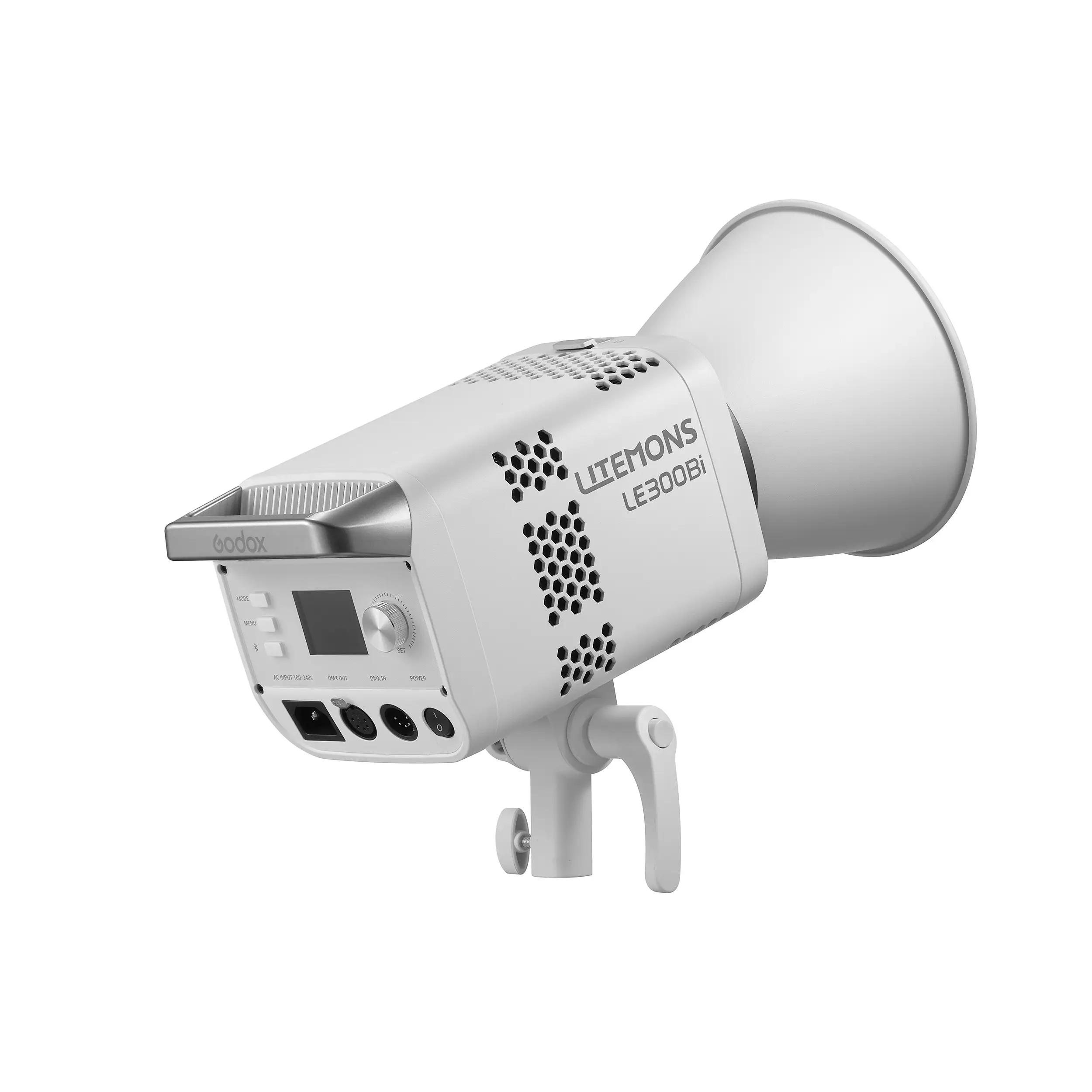 Godox LITEMONS LE300Bi — это биколорный светодиодный осветитель мощностью 320 Вт с питанием от сети 100-240 В. Прибор характеризуется высоким световым потоком, регулируемой цветовой температурой от 2800K до 6500K и исключительными индексами цветопередачи (CRI/TLCI ≥98). Оснащен встроенным блоком питания, интеллектуальной системой охлаждения и байонетом Bowens для установки светоформирующих насадок. Управление возможно как с панели на корпусе, так и дистанционно через Bluetooth, DMX512 или CRMX (опция).
