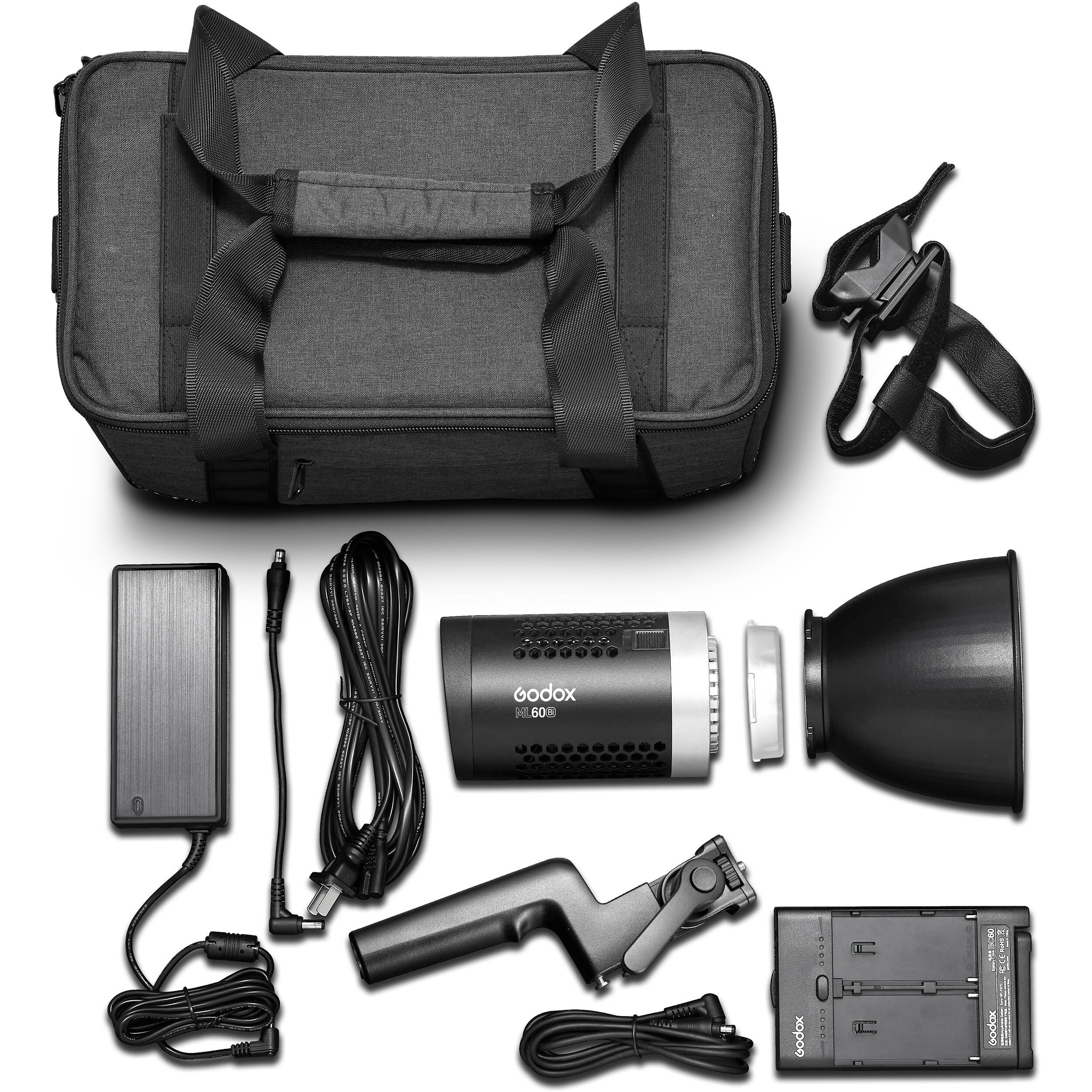 В комплект входит полужесткая сумка-кофр Godox для хранения и транспортировки осветителя. Размеры сумки 350х230х190мм, вес комплекта в сумке 3.2кг.