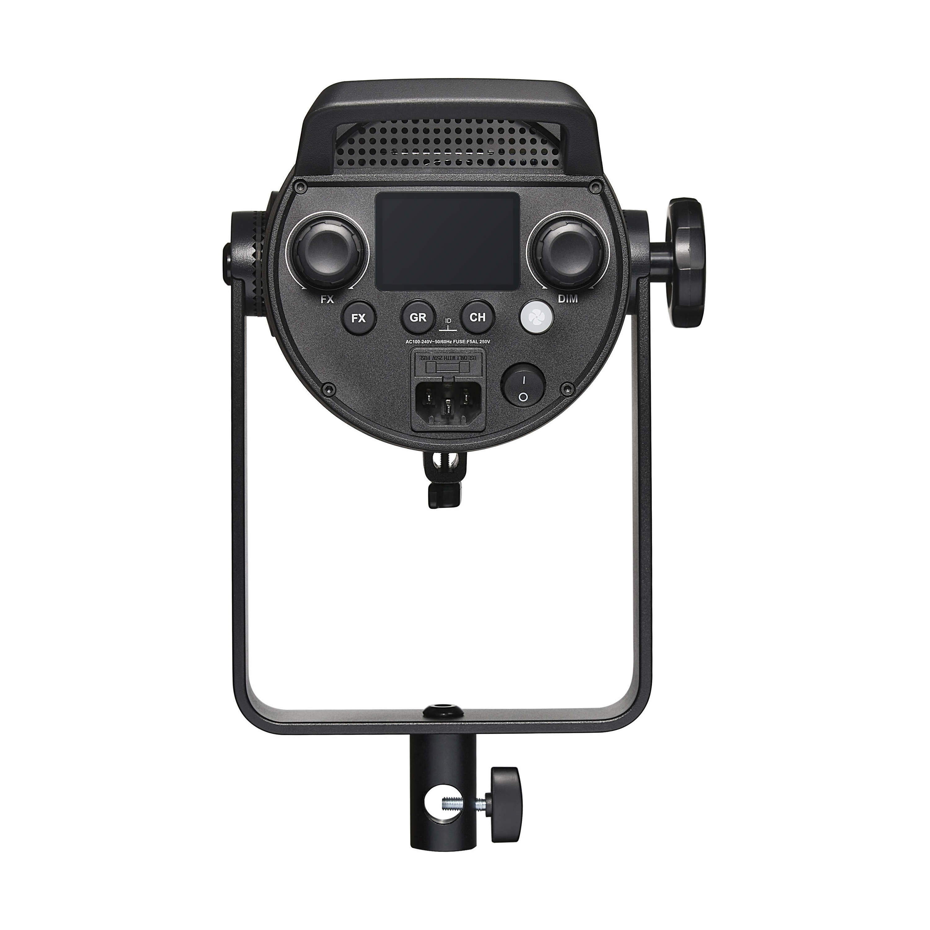 Кронштейн-лира обеспечивает вращение осветителя на 360° и наклон на 330°, может устанавливаться на студийные стойки, держатели, пантографы со стандартным шпиготом 5/8 дюйма.