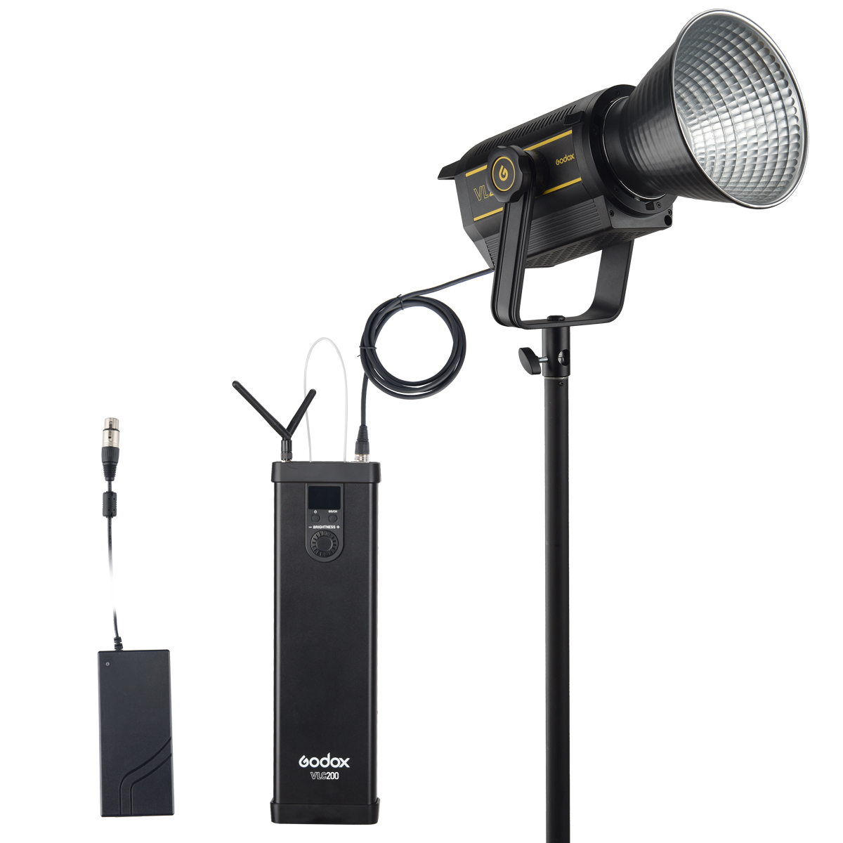 Осветитель VL200 управляется и питается от внешнего блока управления (контроллера), что делает его автономным и простым в управлении. Питание осуществляется от сети (сетевой адаптер входит в комплект) или от аккумуляторных батарей типа V-mount (приобретается отдельно).