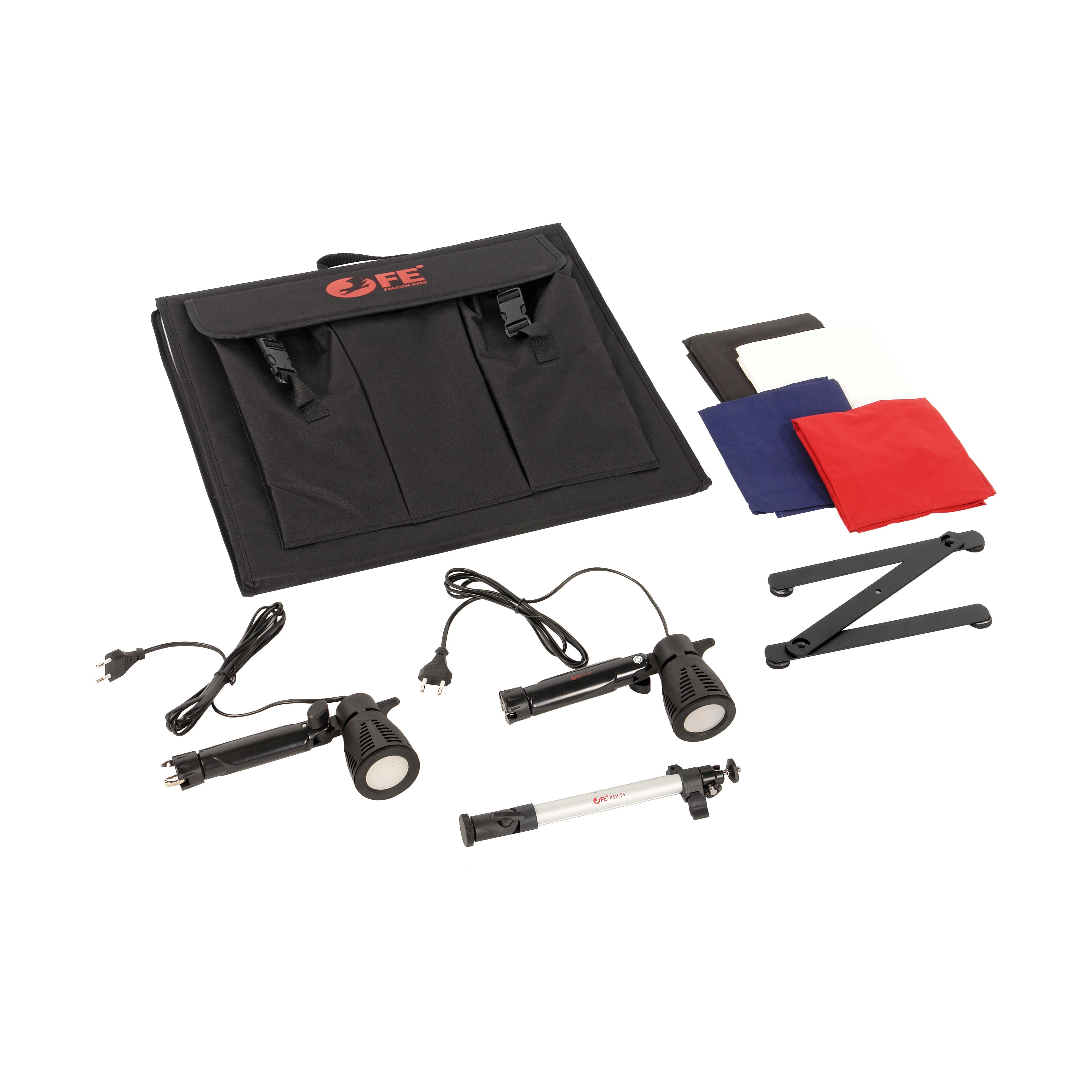 Комплект Falcon Eyes PBK-50AB-2LED является передвижной настольной мини-студией и идеально подходит для предметных съемок небольших изделий, ювелирных украшений, натюрмортов, макросъемки, также используется для съемок продукции интернет-магазинов.