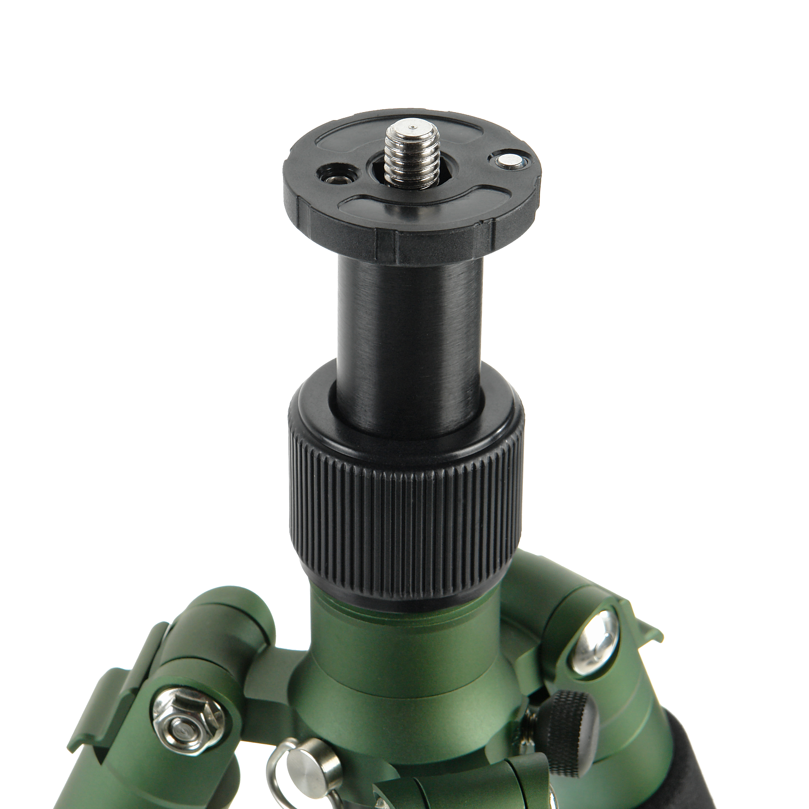 Регулировка центральной колонны по высоте добавляет гибкости при съемке. Снизу колонны находится крюк для груза-противовеса, положение колонны прочно фиксируется цанговым зажимом. Центральная колонна съемная, это позволяет установить камеру в самое нижнее положение при съемке, перевернув колонну головкой вниз. Для этого необходимо, предварительно отсоединив от колонны головку и площадку, вставить ее в отверстие крестовины сверху, после чего установить площадку и головку в нижнем положении.