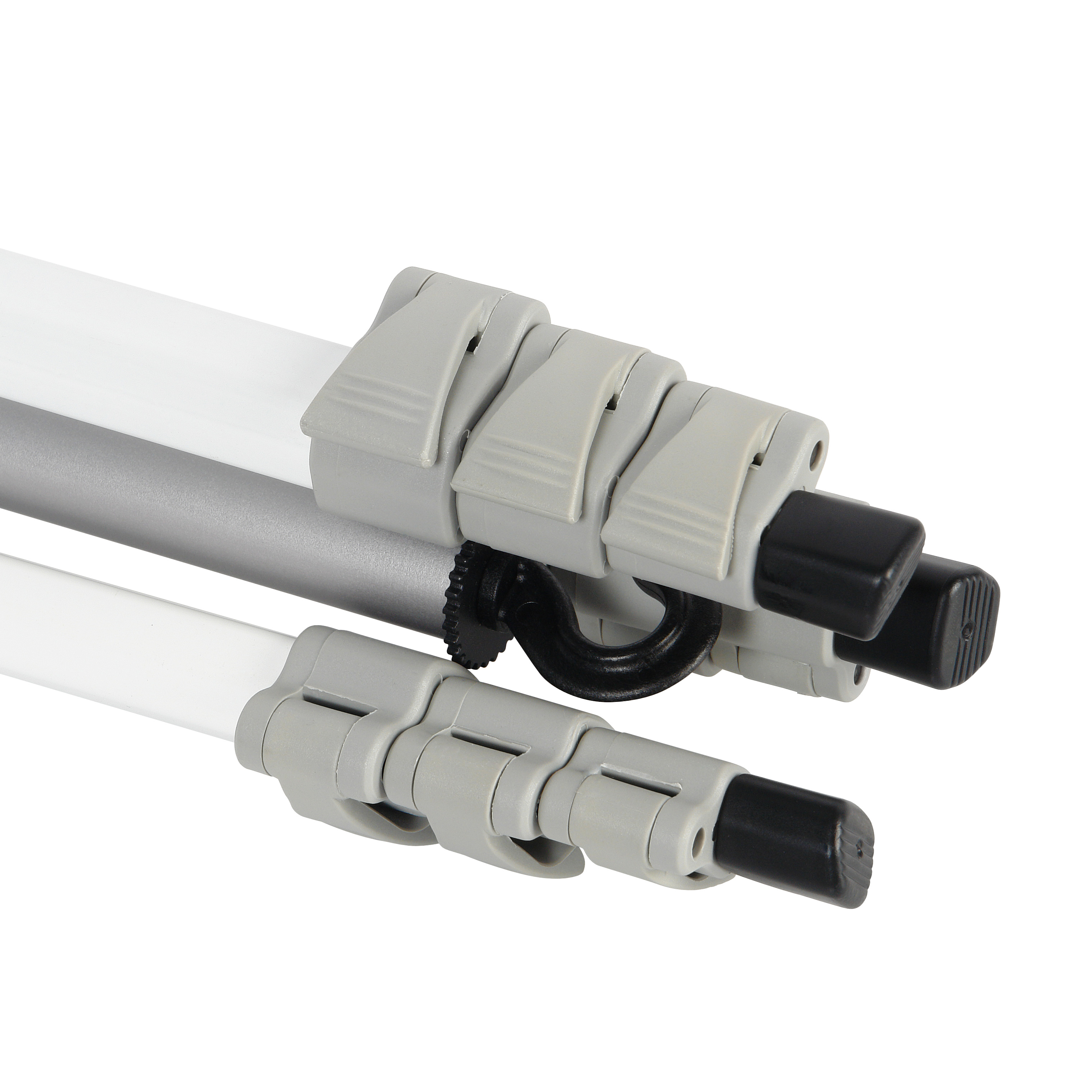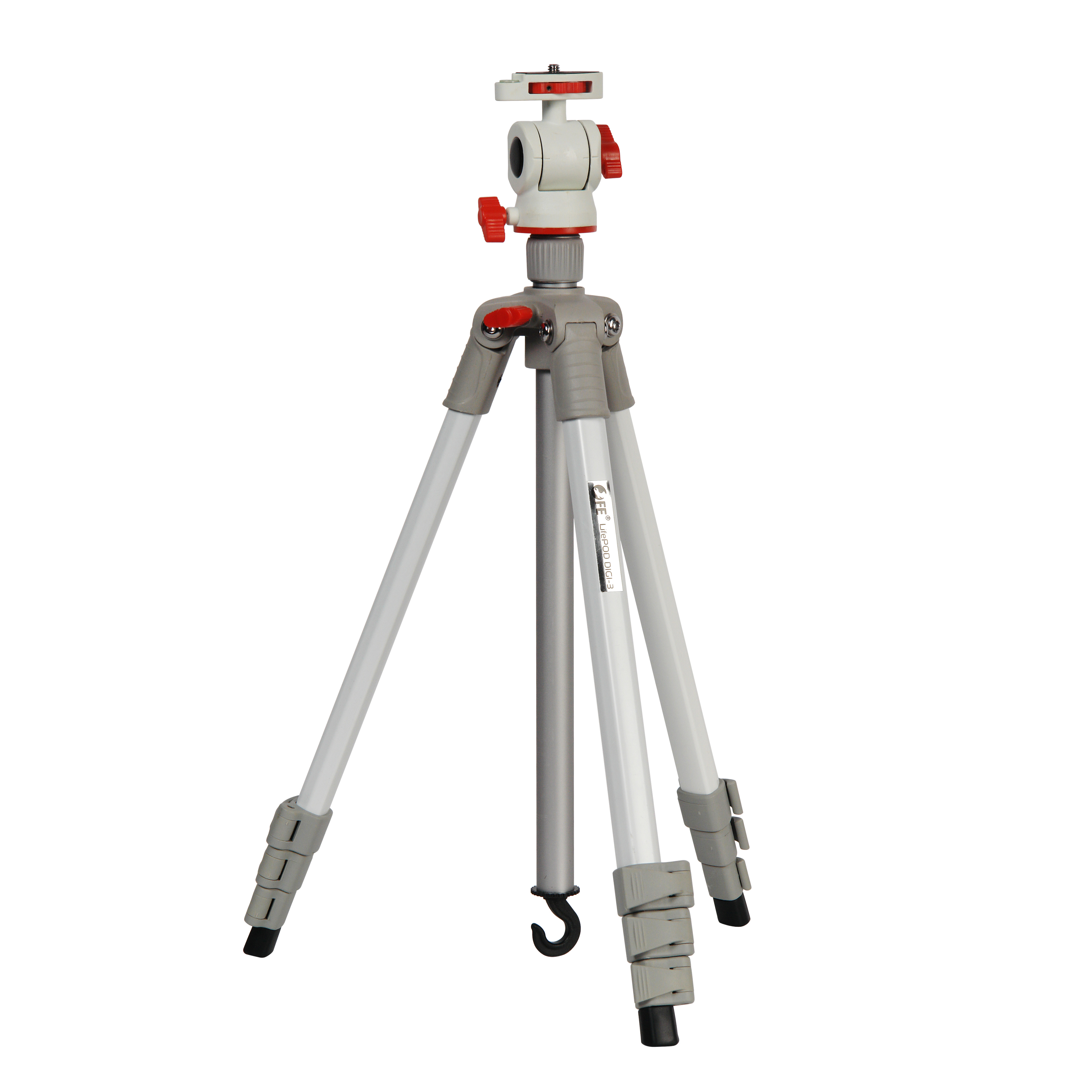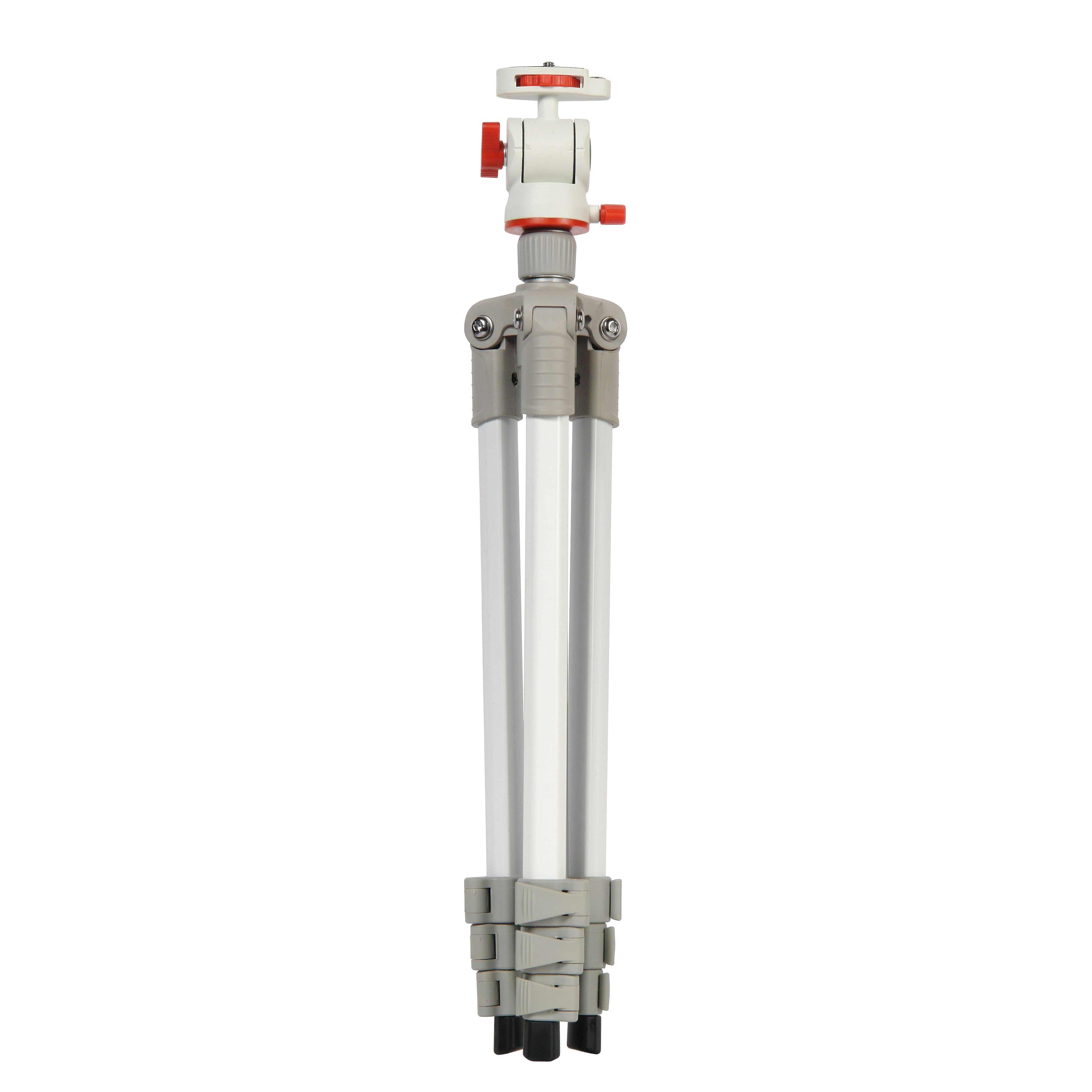 Профиль телескопических секций 20/17/15/11 мм сложной формы выдерживает большие нагрузки на рабочей высоте. Секции фиксируются при помощи клипсовых зажимов из прочного ABS-пластика; тренога быстро раскладывается, поэтому штатив приводится в рабочее состояние за несколько секунд.