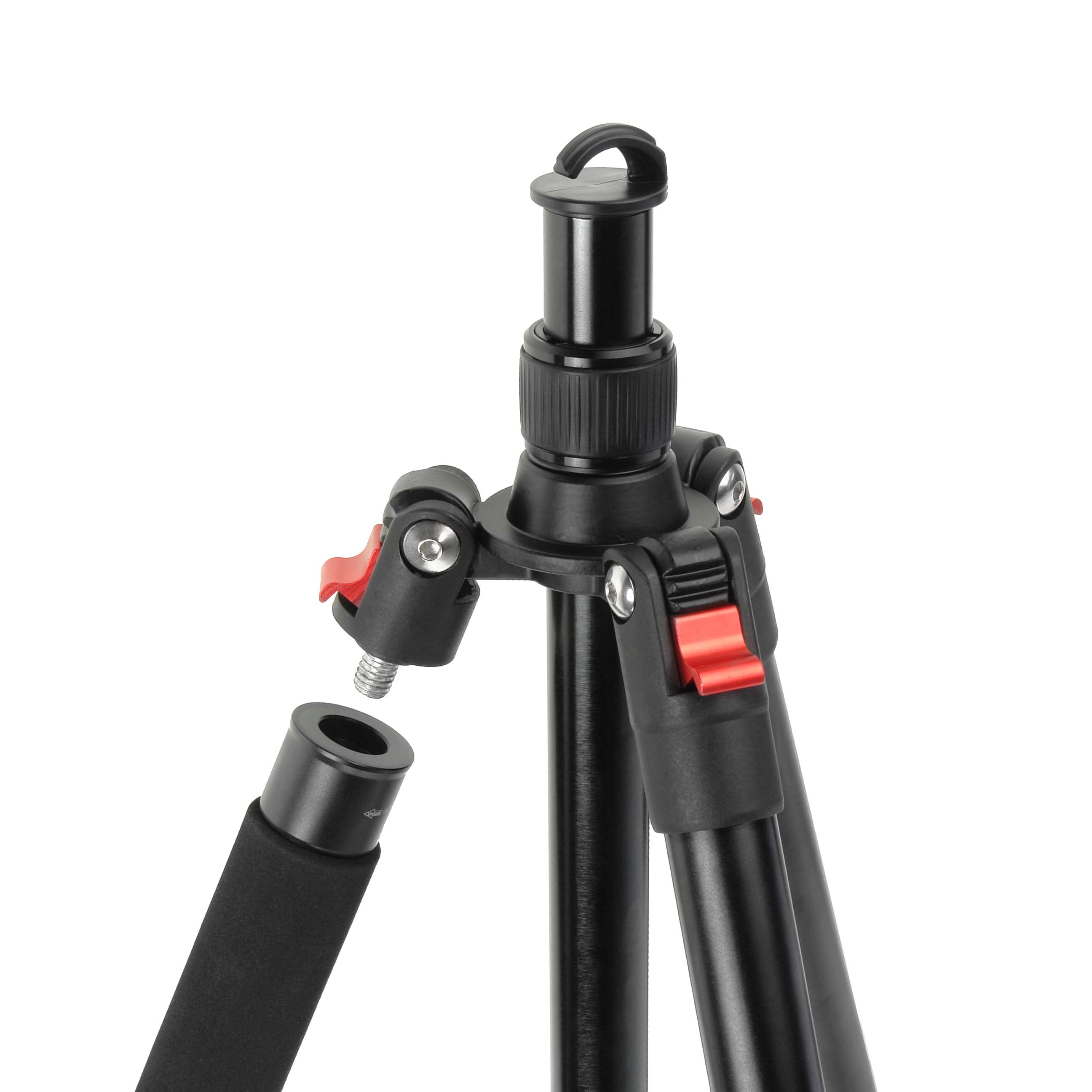 Одна из ног (с противоскользящей вспененной накладкой) штатива съемная, соединив её с центральной колонной и головкой можно получить монопод высотой от 51 до 132 см, который незаменим в репортажных съемках.