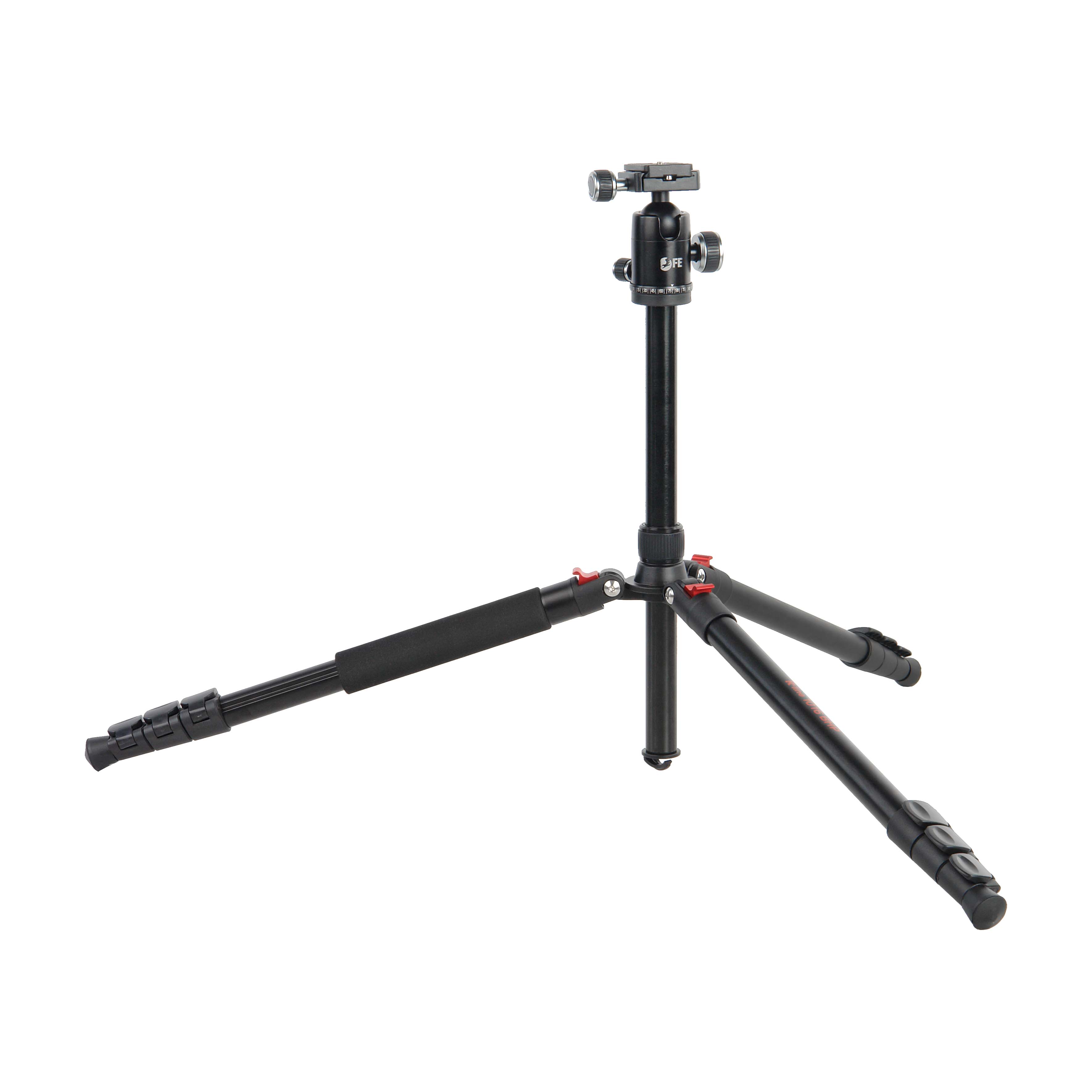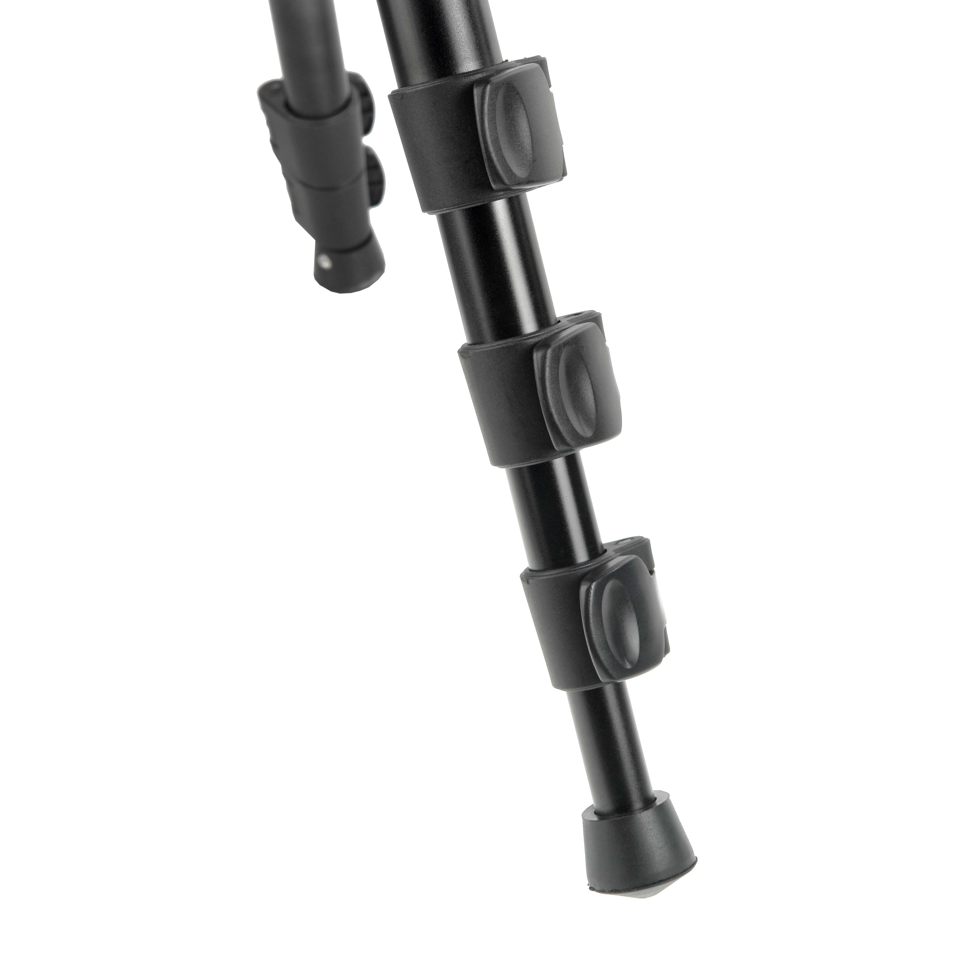 Штатив можно легко подготовить к работе, выбрав высоту установки камеры от 47 до 1.6 м разложив секции треноги и выдвинув или задвинув центральную колонну. Ноги штатива имеют три фиксированных положения угла наклона. Фиксация ног штатива под разным углом дает возможность использовать в качестве опоры ступени, камни и другие сложные поверхности, а также проводить съемку с более низкой точки. Реверсивно складывающиеся ноги уменьшают габариты конструкции в сложенном виде. Клипсовые зажимы надежно соединяют между собой 4 секции ног, резиновые наконечники на ногах придают штативу дополнительную устойчивость и противодействуют появлению царапин на поверхности пола.