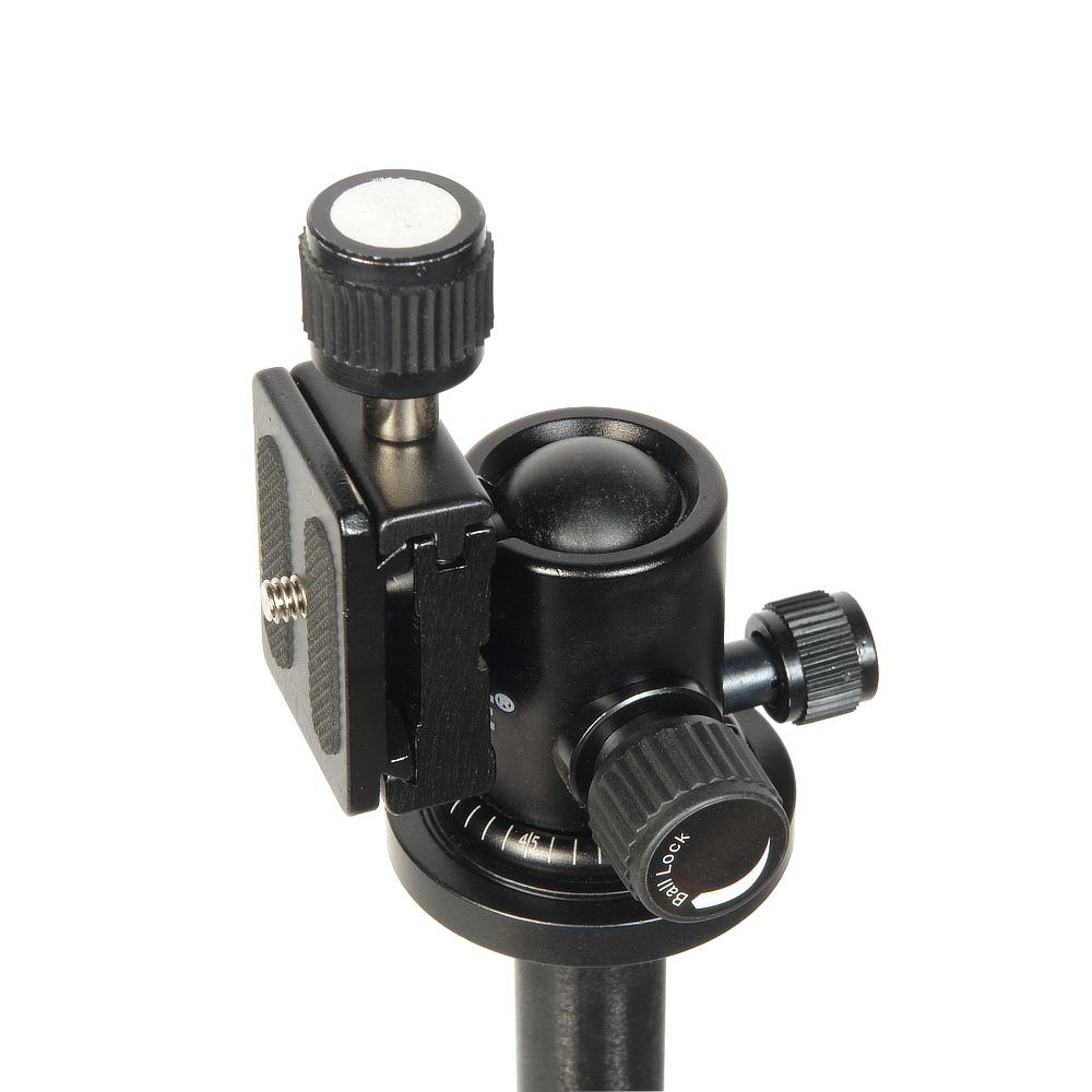 Плавно поворачивать камеру на 360° вокруг своей оси позволяет шаровая штативная голова, установленная на платформу со шкалой для горизонтального панорамирования. Голова сменная, выполнена из алюминиево-магниевого сплава. Регулировочный винт помогает надежно зафиксировать ее в нужном положении. Шаровая конструкция с вертикальным пазом дает возможность изменять наклон площадки с камерой в пределах –90 до +45°. Быстросъемная площадка оборудована винтом 1/4” для установки оборудования и предохранителем от случайного перемещения.