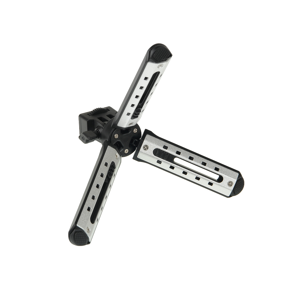 Алюминиевые накладки на ножках и стальные крепежные винты усиливают предельно облегченную (116 г) конструкцию. Размах ножек – от 18 до 25 см – повышает ее устойчивость. Ножки завершаются резиновыми накладками с насечками, что позволяет размещать трипод с оборудованием на гладкой поверхности, например полированной или стеклянной.