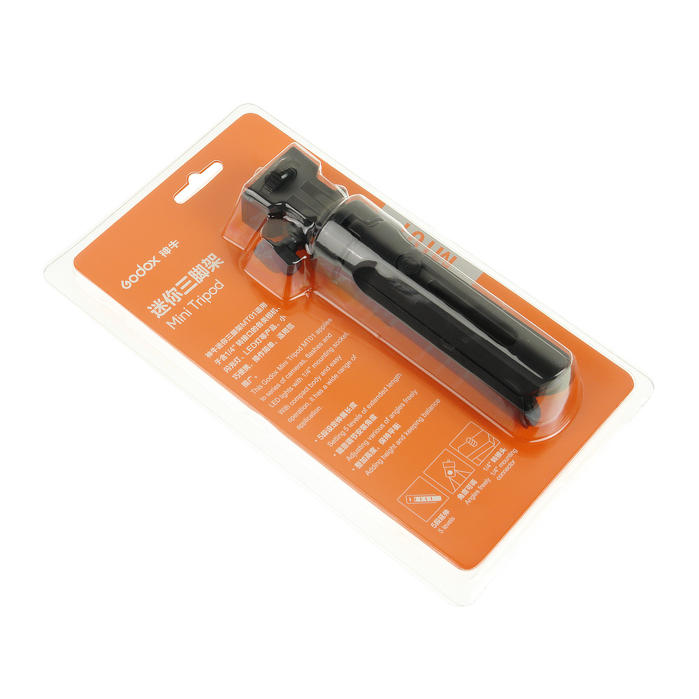 Godox MT01 – мини-штатив с наклонной головой и посадочным винтом 1/4”. Конструкция рассчитана на нагрузку 2,5 кг и может использоваться для установки цифровых фото- и видеокамер. Также, на трипод можно установить вспышку , вспышку для смартфона , а с помощью и из ассортимента Falcon Eyes можно закрепить смартфон, клетку для смартфона, микрофон и другие устройства.