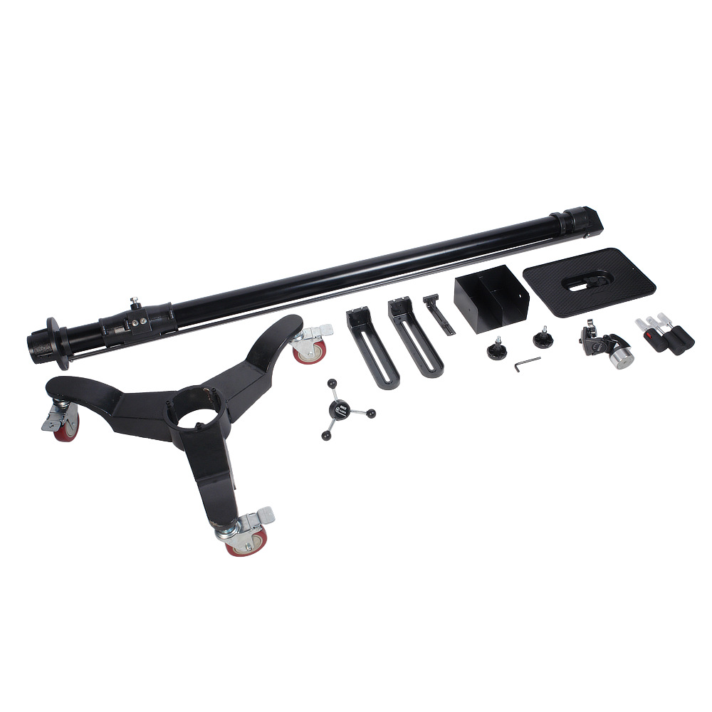 Для удобства передвижения по студии штатив установлен на 3 колеса диаметром 100 мм. Каждое колесо снабжено тормозом.
