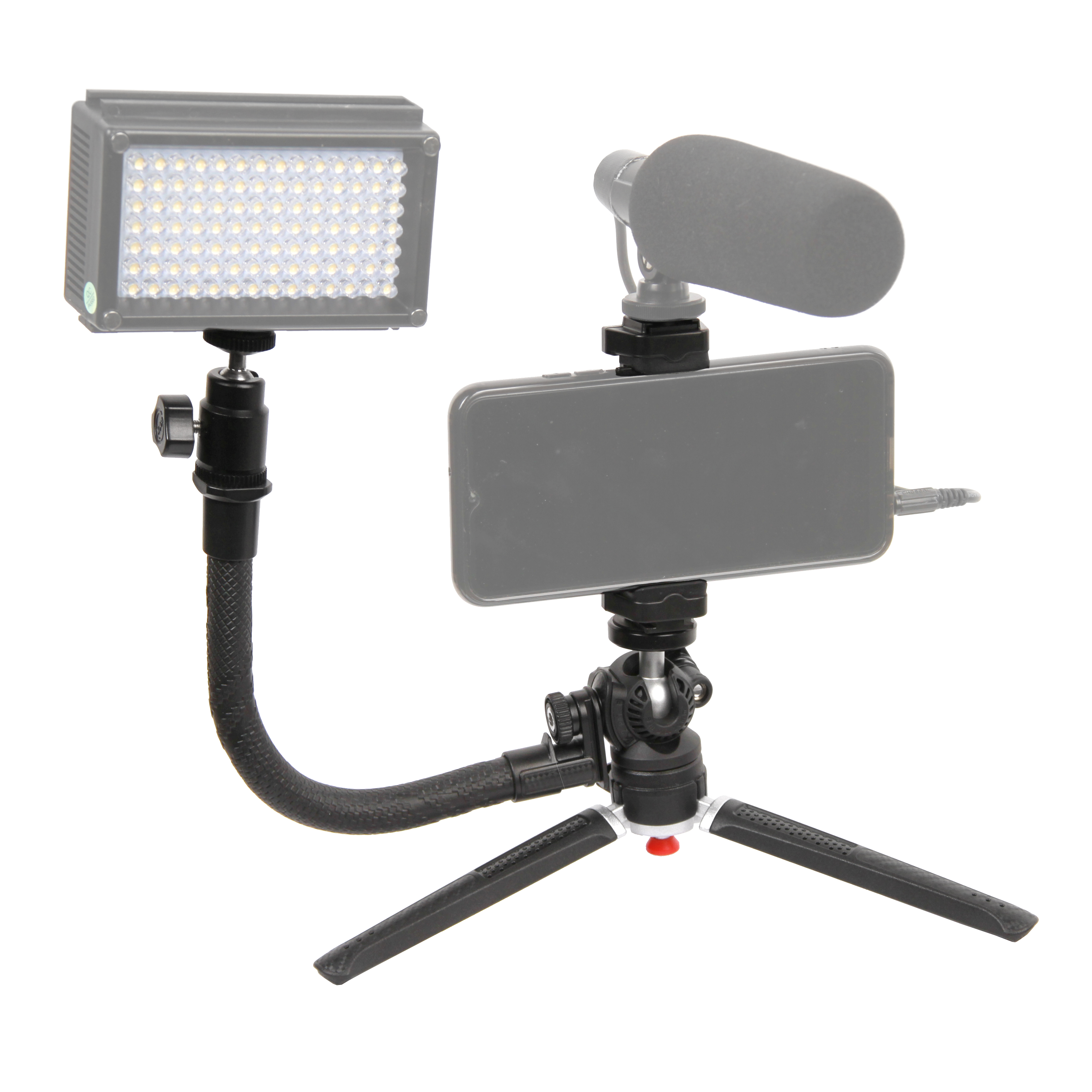 Используя разные сочетания крепежа, к примеру, можно установить фотокамеру и смартфон (для одновременной вертикальной и горизонтальной записи), закрепить накамерный осветитель и микрофон и т.д.