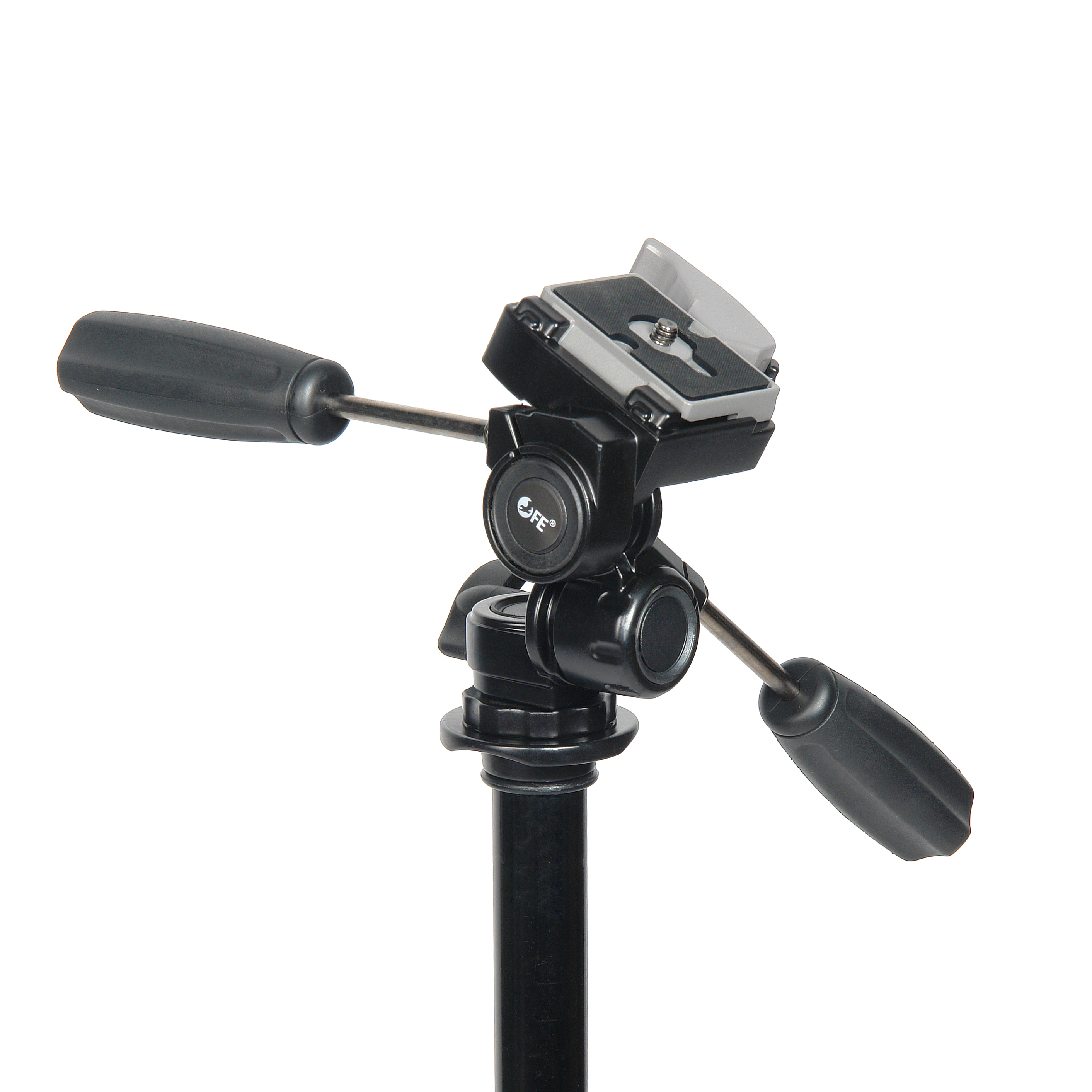 Плавное свободное движение камеры в трех плоскостях обеспечивает 3D-головка. Благодаря прецизионному исполнению сопрягаемых деталей и специальной смазке головка с легким усилием перемещает камеру на 360° по горизонтали, с наклоном до 90° вверх и до 40° вниз. Резиновая кольцевая прокладка под головкой амортизирует удар камеры при случайном ослаблении фиксатора колонны. Положение головки закрепляется 2 винтами-рукоятками. Для удобства панорамной съемки две рукоятки длиной по 140 мм можно соединить в одну.