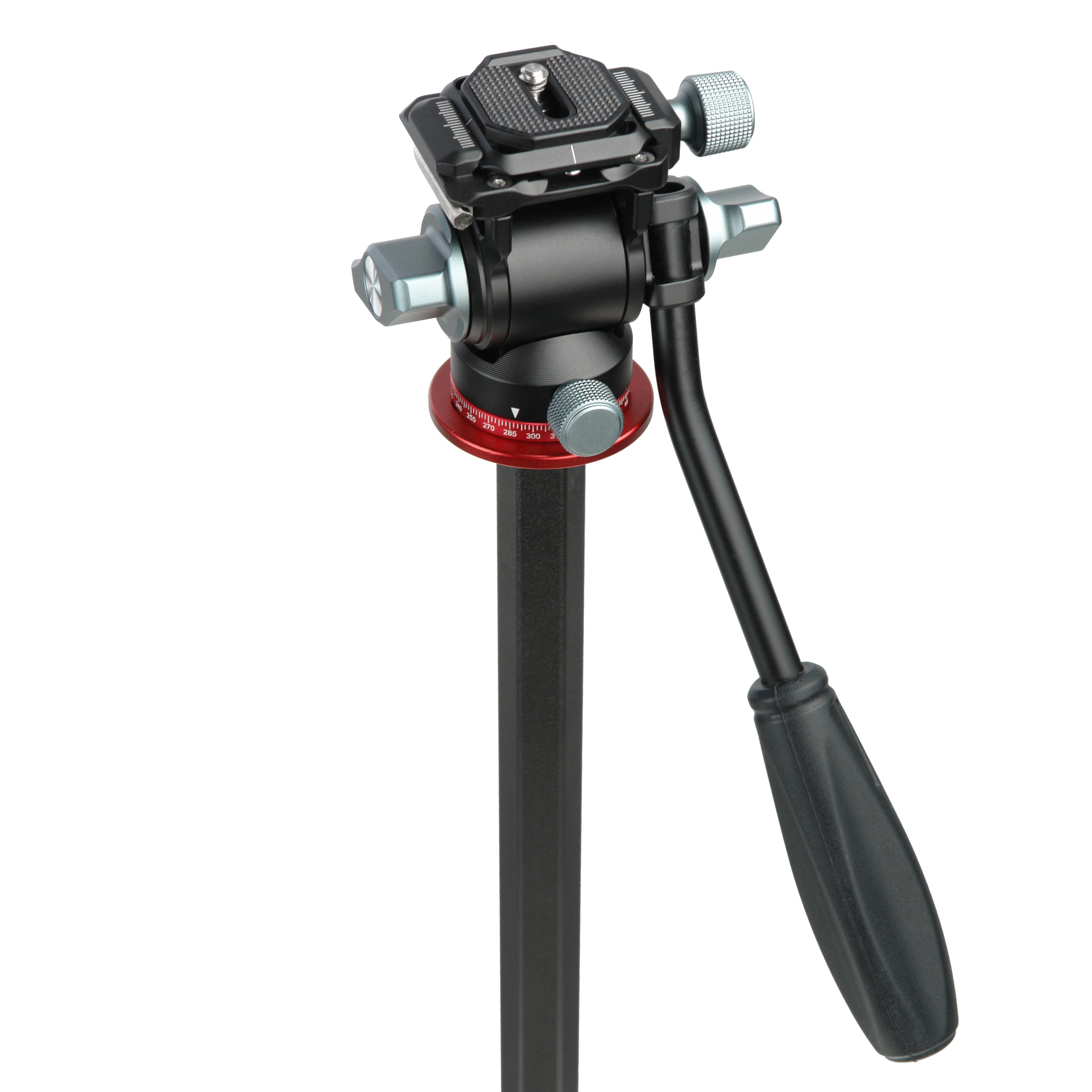 2D видеоголовка с жидкостным демпфированием позволяет делать плавные горизонтальные и вертикальные панорамы. Горизонтальное панорамирование можно проводить без ограничений на 360°, а наклон – в пределах от -80° до +90°. Видеоголовка имеет стопоры панорамирования, которые также могут использоваться как регуляторы усилия демпфирования. Головка, зафиксированная с наклоном на 90°, даст возможность делать вертикальные кадры при фото или видеосъемке.