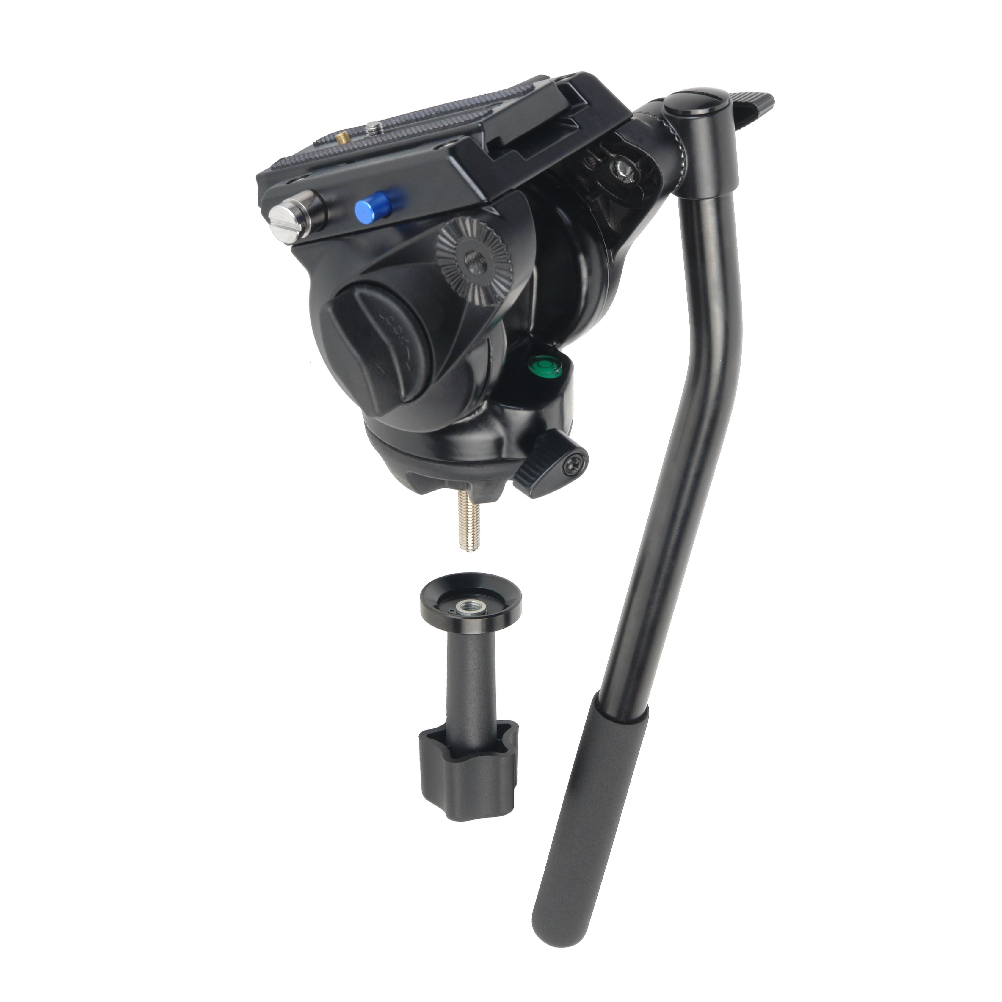 2D-жидкостная видеоголовка штатива вращается вокруг своей оси на 360 и наклоняться в пределах от +90 до -75 для проведения плавного горизонтального и вертикального панорамирования. Головка изготавливается из легкого и прочного алюминиево-магниевого сплава, оборудована быстросъемной площадкой, съемной рукояткой и пузырьковым уровнем. На штативной головке также предусмотрено резьбовое отверстие 3/8" для установки дополнительного оборудования или обвеса: осветителя, микрофона, монитора.