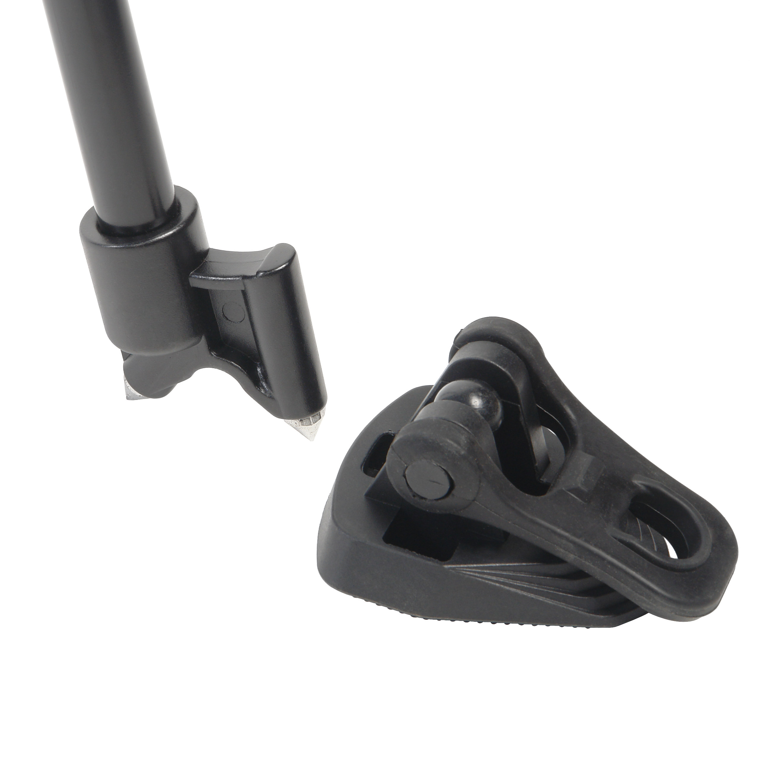 Алюминиевый трипод штатива представляет собой 3-секционную рамочную конструкцию с ногами из легких трубок Ø20 и 14 мм. Секции опор независимо выдвигаются и фиксируются клипсовыми зажимами, что дает возможность устанавливать штатив на неровной поверхности. Нижние секции опор оканчиваются шипами, на которые надеваются резиновые опоры для контакта с поверхностью. Опоры-башмаки обеспечивают устойчивое сцепление с гладким полом, а шипы – с грунтом. Высота штатива регулируется от 90 до 184 см, в сложенном виде длина штатива – 91 см.
