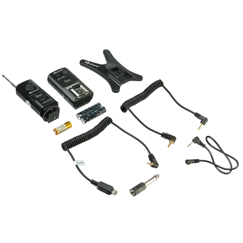 В комплекте: две батарейка типа ААА, одна батарейка типа 23А, синхрокабель 2,5 мм — PC, синхрокабель 2,5 мм — 3,5 мм, синхрокабель 2,5 мм — синхроконтакт камеры (см. таблицу совместимости), переходник 3,5 мм — 6,3 мм.