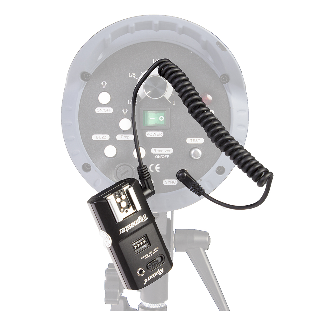 Приемник подключается к накамерной вспышке с помощью разъема «горячий башмак» или к студийной вспышке синхрокабелем из комплекта, работает двух батареек типа ААА и «запускает» вспышку при получении сигнала от передатчика. Резьба 1/4" позволит закрепить приемник с вспышкой на опоре (стойка, штатив