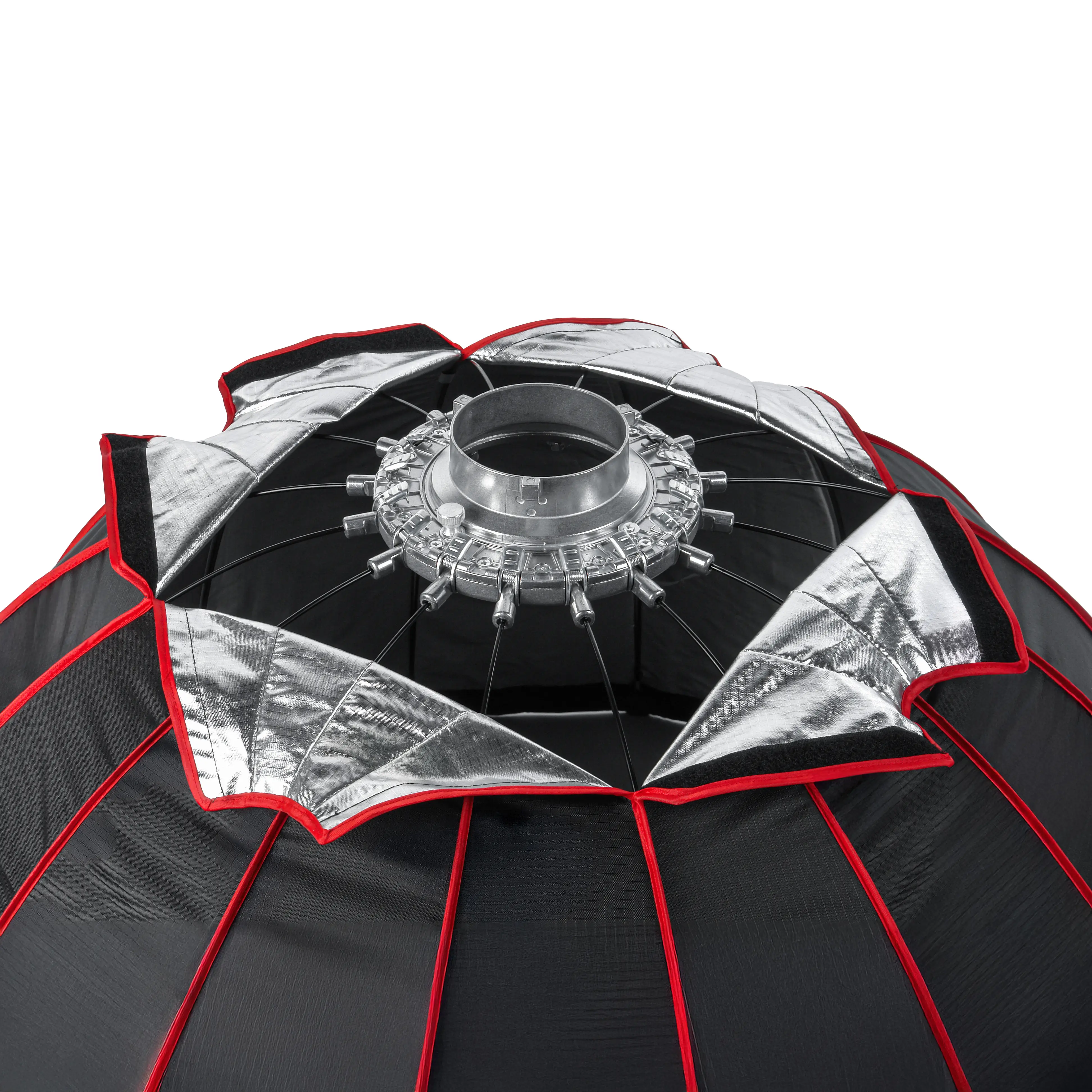 Сборка софтбокса занимает считанные секунды. Чтобы подготовить софтбокс к работе, нужно приподнять спицы над установочным кольцом до щелчка фиксации. Для ускорения процесса сборки можно одновременно поднимать по две спицы, расположенные на противоположных сторонах кольца. Для того, чтобы сложить софтбокс, нужно немного приподнять спицу и нажать на кнопку.