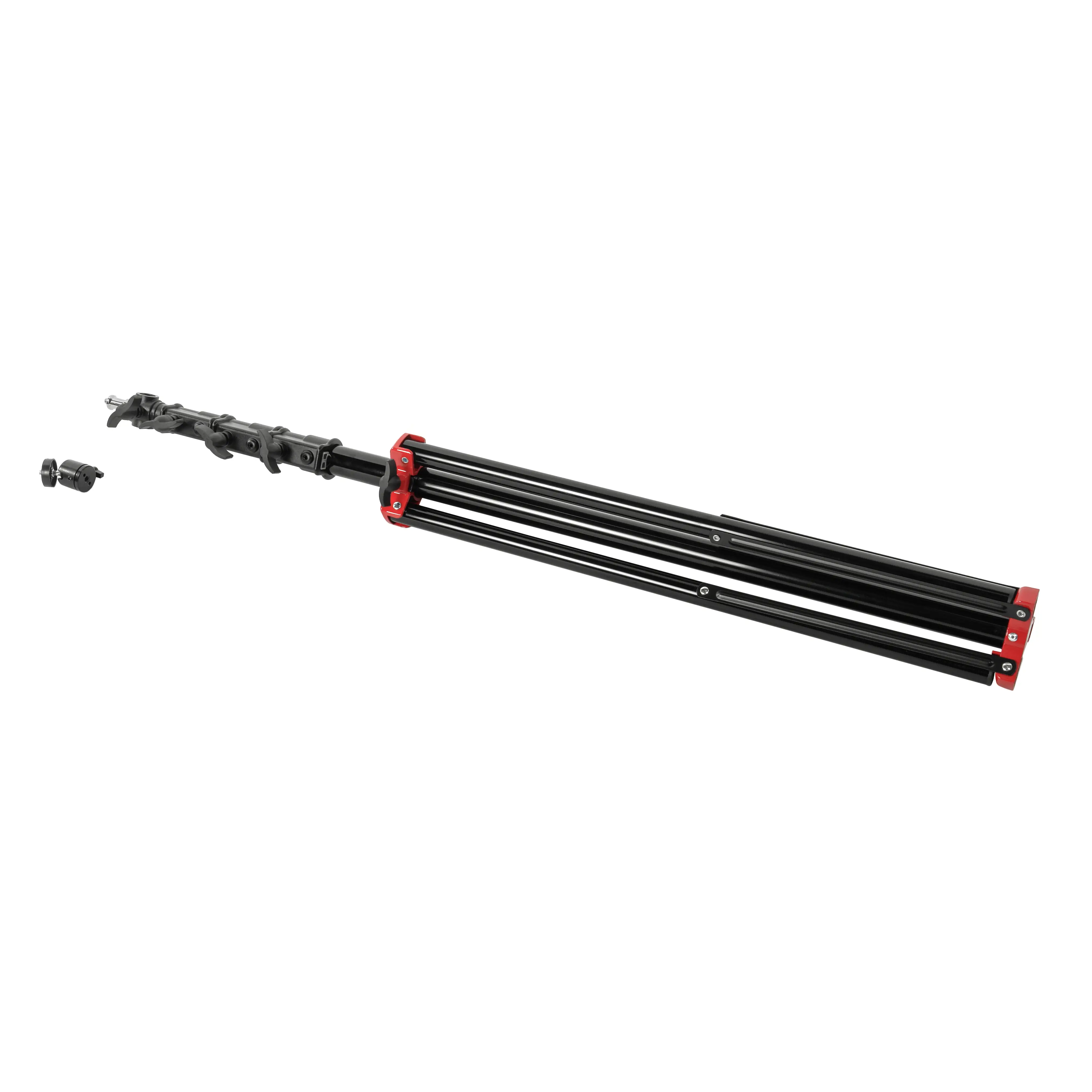 Основание стойки представляет собой складную треногу с винтовым фиксатором. Максимальный размах ножек достигает 106 см, обеспечивая надежную опору для крепления оборудования. Ножки стойки стабилизированы специальной алюминиевой растяжкой, повышающей общую устойчивость конструкции. При съемке в сложных условиях можно закрепить на основании стойки дополнительный груз, например, , заполненный песком.