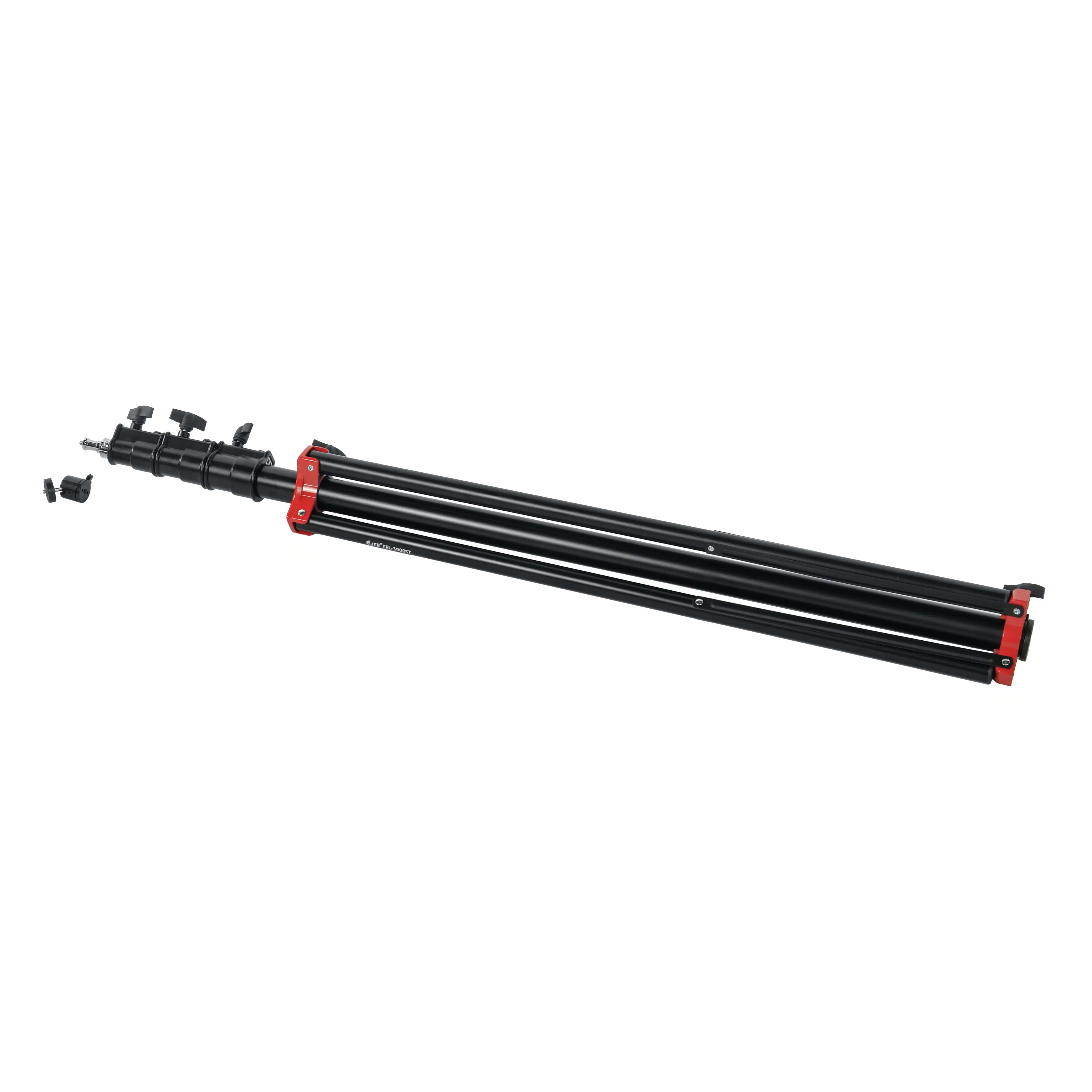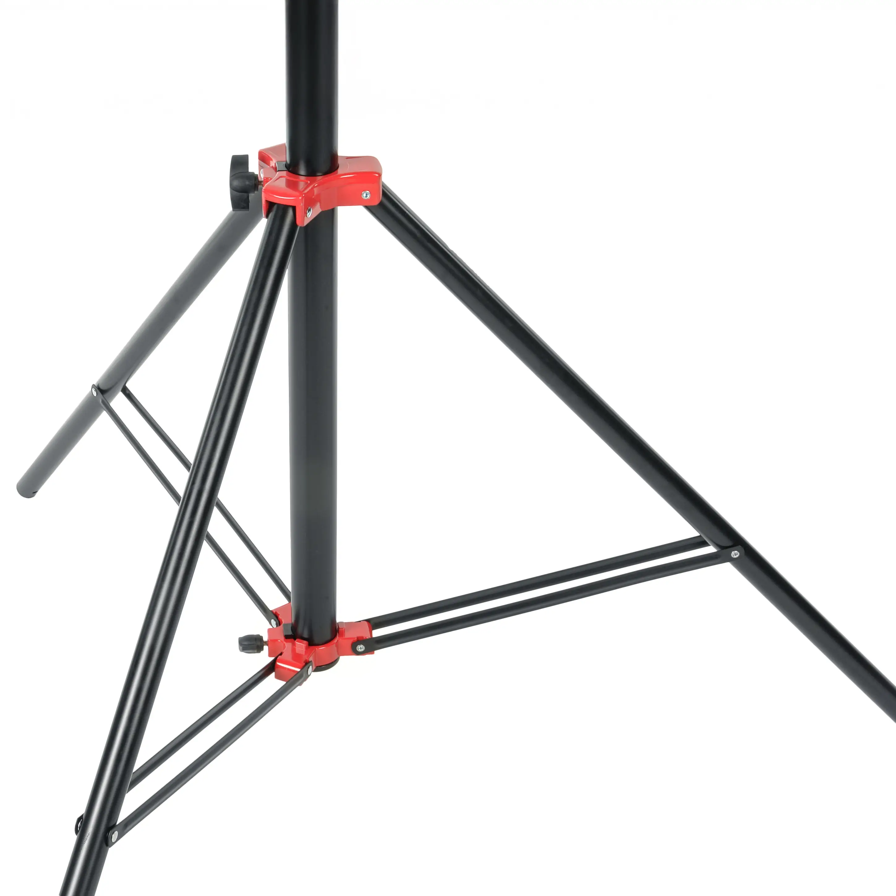Высота стойки плавно изменяется в диапазоне от 135 до 390 сантиметров благодаря телескопическому выдвижению секций центральной колонны. Степень устойчивости и общая высота изделия дополнительно регулируется положением ног основания.