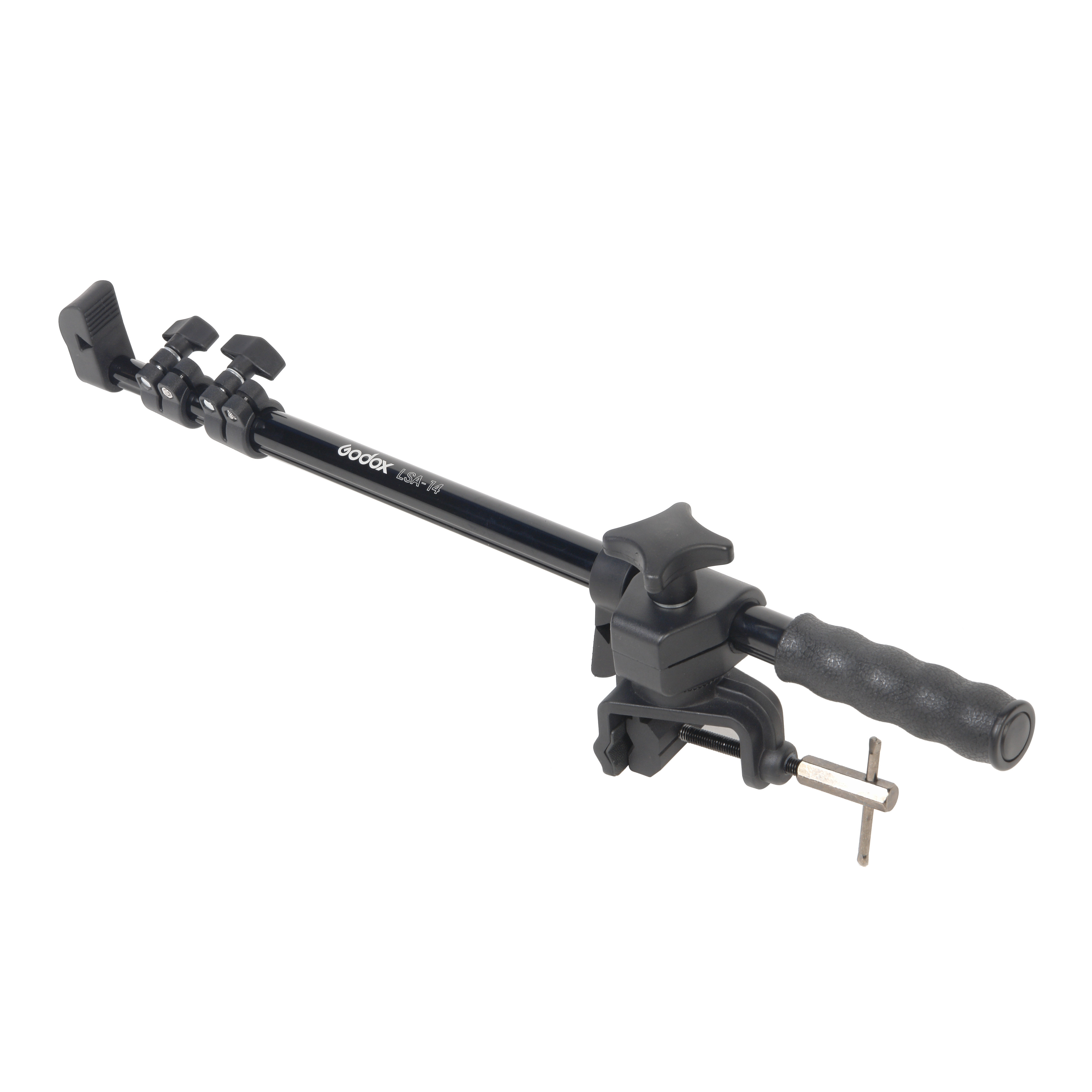 Держатель отражателя Godox LSA-14 предназначен для крепления лайт-дисков (или фонов на металлическом каркасе). Легкая телескопическая перекладина при помощи струбцины может устанавливаться на стойках, перекладинах, столешницах максимальной толщиной до 38 мм. Ручка с противоскользящей накладкой из резины с удобным хватом под пальцы позволит также удерживать держатель с отражателем в руке даже длительное время.