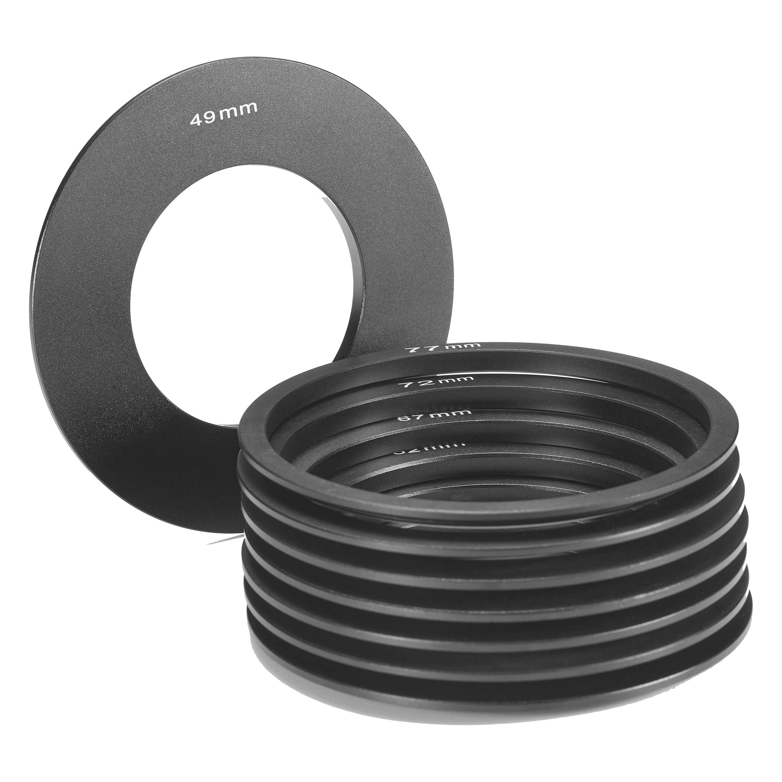В набор входят 8 переходных колец наиболее популярных размеров (49 мм, 52 мм, 55 мм, 58 мм, 62 мм, 67 мм, 72 мм, 77 мм), которые подходят для большинства объективов различных производителей.