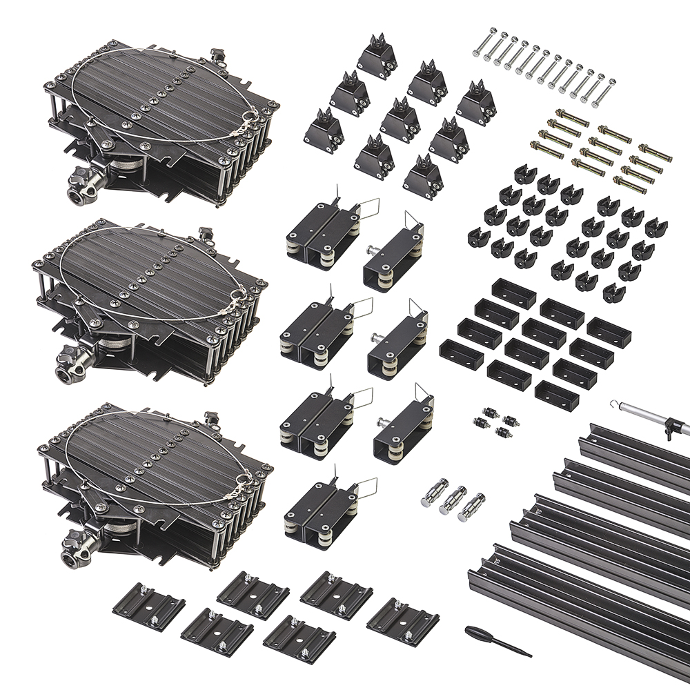 Две одинарные направляющие рельсы длиной 3 метра фиксируются на потолке с помощью крепежных пяток, через спаренные каретки к ним крепятся двойные подвижные рельсы. На подвижные рельсы длиной 3 метра устанавливаются одинарные каретки, которые позволяют передвигать пантографы с оборудованием по подвижным рельсам. На каждой каретке имеется по четыре ролика на подшипниках, движение по направляющим происходит плавно и без рывков.