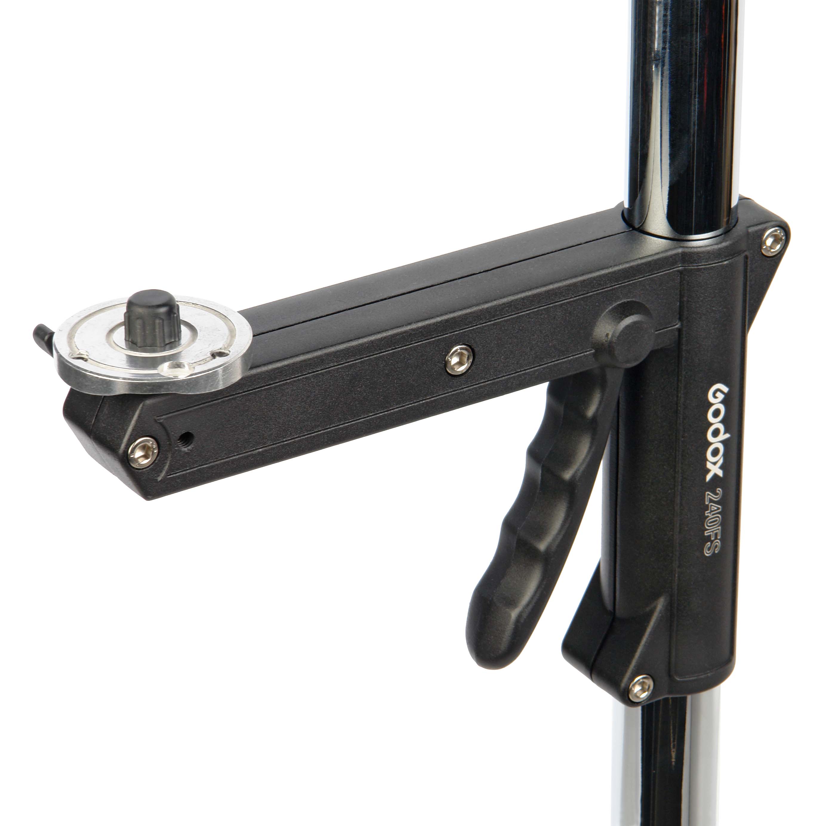 Студийная стойка Godox 240FS на колесах оснащена консолью с подвижным рычажным зажимом-фиксатором, позволяющим быстро регулировать высоту установки различных приборов – осветителя, вспышки, фотоаппарата, ноутбука или других устройств и аксессуаров.