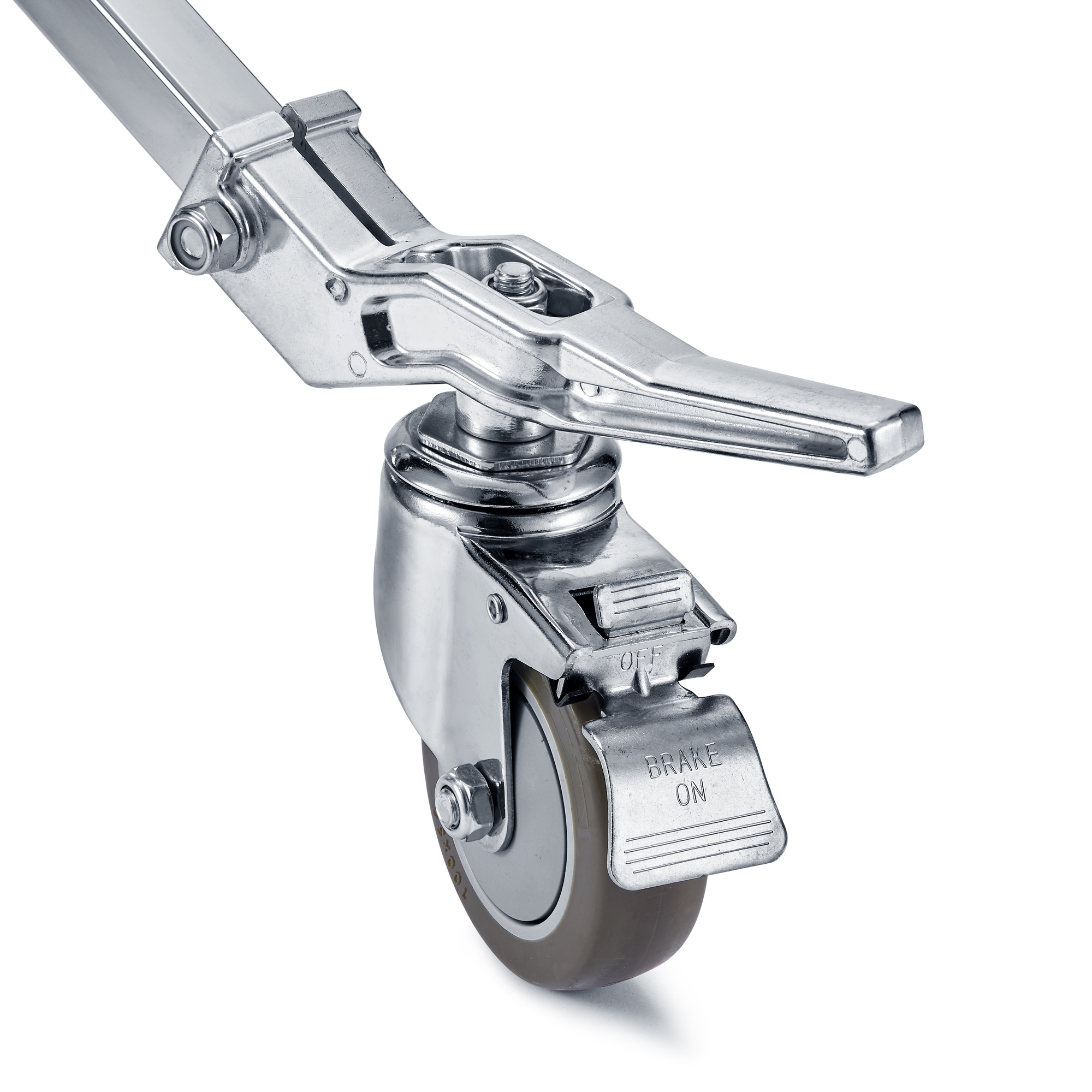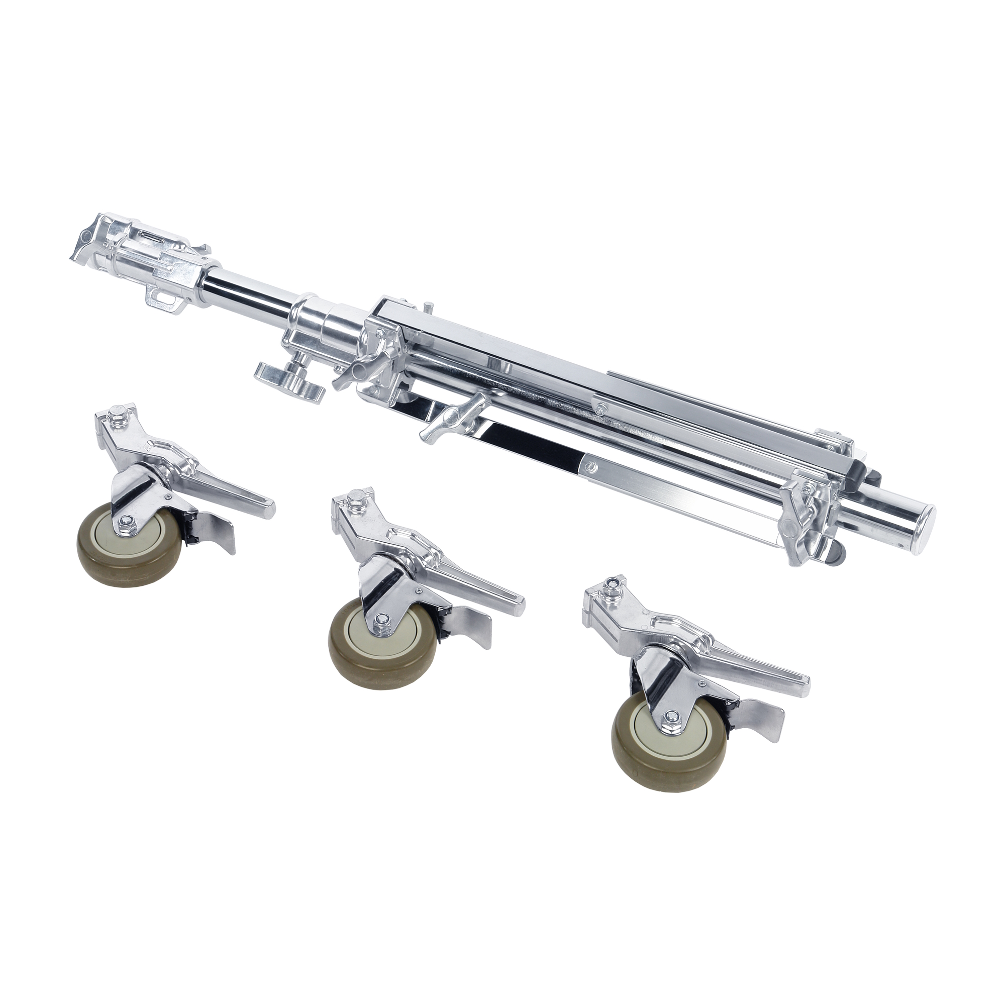Нагруженную стойку просто переместить благодаря устойчивой колесной опоре с тремя колесами с тормозным механизмом. Большие легко вращающиеся колеса Ø100 мм оснащены с подшипниками и резиновым протектором, чтобы преодолеть такие препятствия, как кабель-каналы или другие неровности. Тормозной механизм убережет стойку от случайного перемещения.