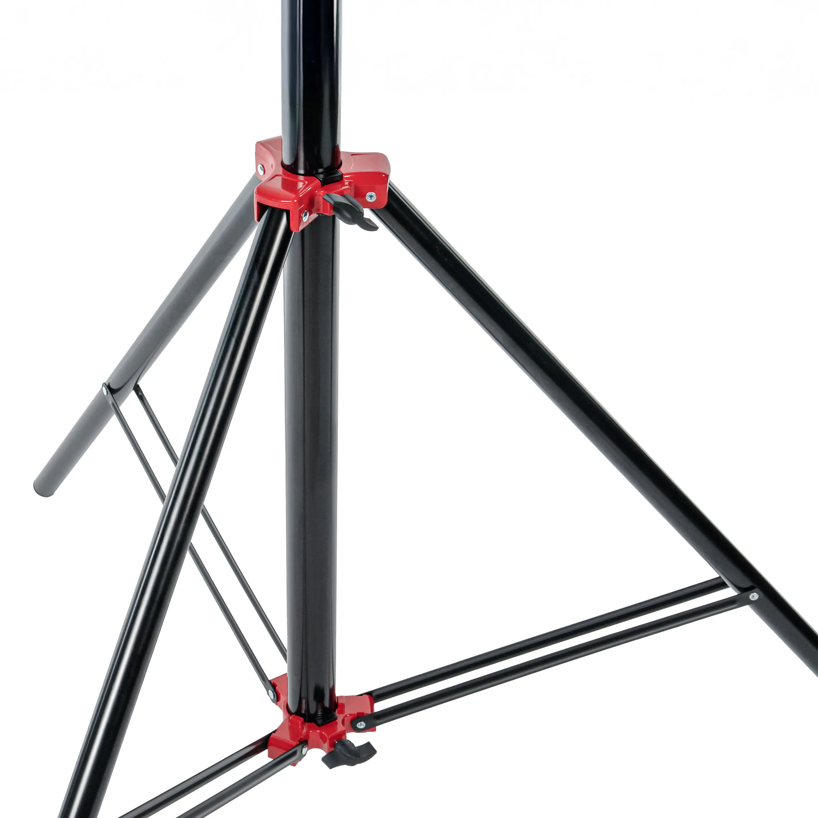 Основание стойки представляет собой складную треногу с двумя винтовыми фиксаторами. Первый фиксатор удерживает треногу в раскрытом положении, обеспечивая максимальный размах ног основания до 126 см и высокую устойчивость при установке оборудования. Второй фиксатор находится в нижней части центральной колонны и контролирует ее перемещение вверх-вниз относительно основания, позволяя точно подбирать нужную высоту и, при необходимости, создавать четвертую точку опоры.