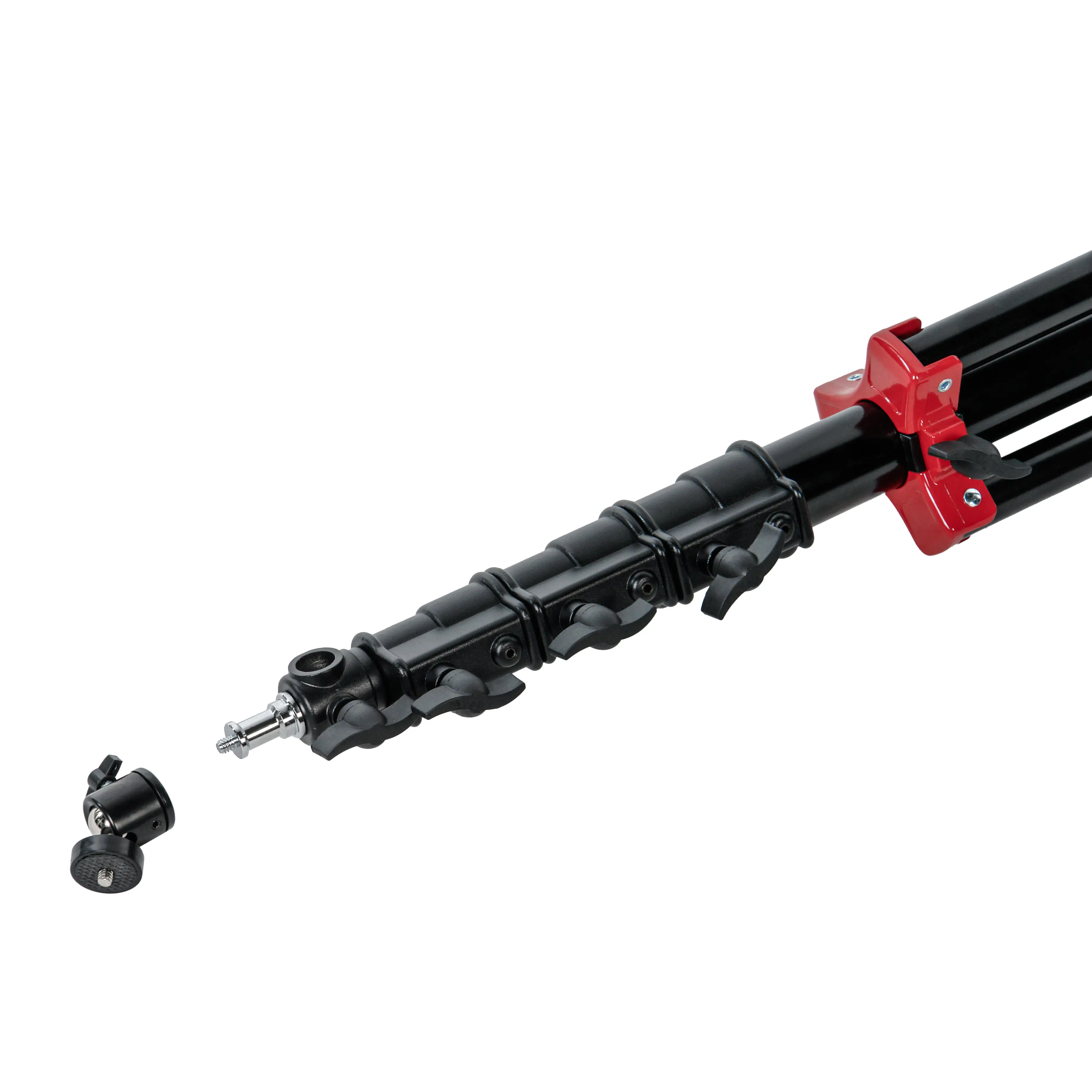 Ножки стойки стабилизированы специальной алюминиевой растяжкой, повышающей общую устойчивость конструкции. При съемке в сложных условиях можно закрепить на основании стойки дополнительный груз, например, , заполненный песком.