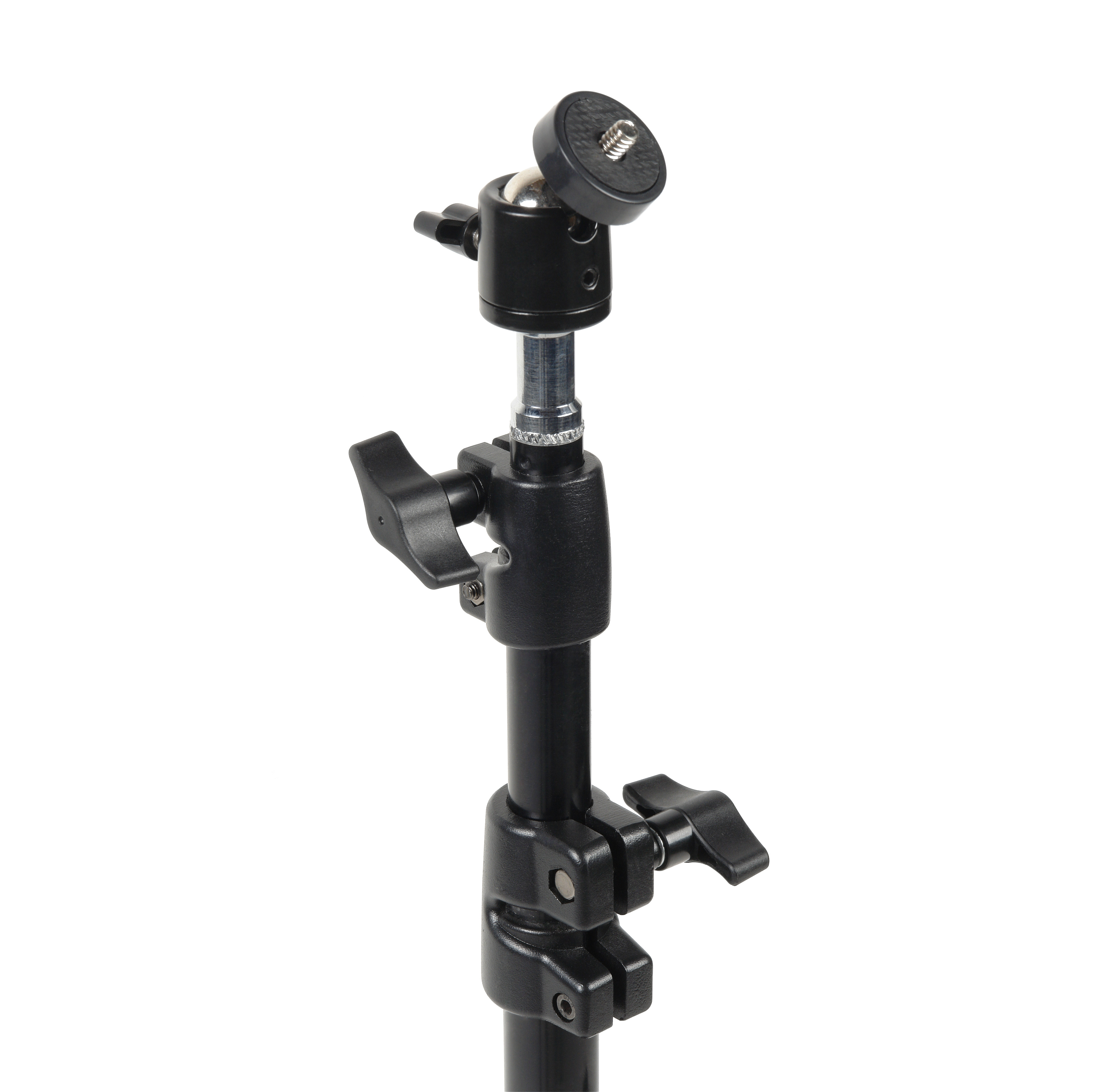 Стойка-тренога Falcon Eyes FlyStand 2200 укомплектована шаровой головкой для установки цифровых камер, головка крепится на резьбу 1/4” на винт стандартного несъемного шпигота 5/8”, который запрессован в верхнюю секцию стойки. Шаровая головка имеет винт фиксации угла поворота шара и снабжена посадочным винтом 1/4” для крепления цифровой камеры.