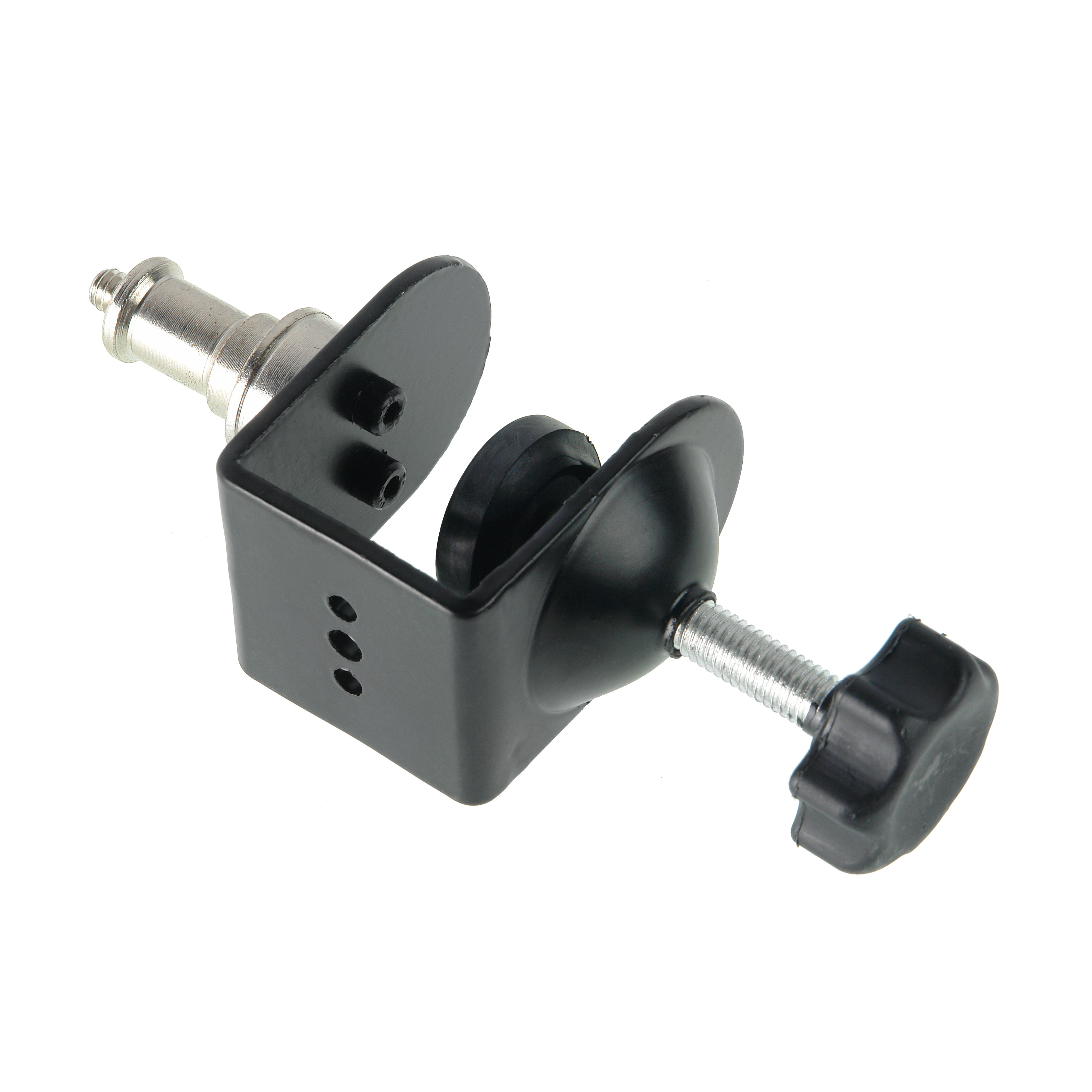 На конце зажима расположен шпигот 5/8" с посадочной резьбой 1/4" - на него устанавливается небольшой осветитель, вспышку, микрофон или любое другое студийное оборудование, имеющее соответствующее крепление.