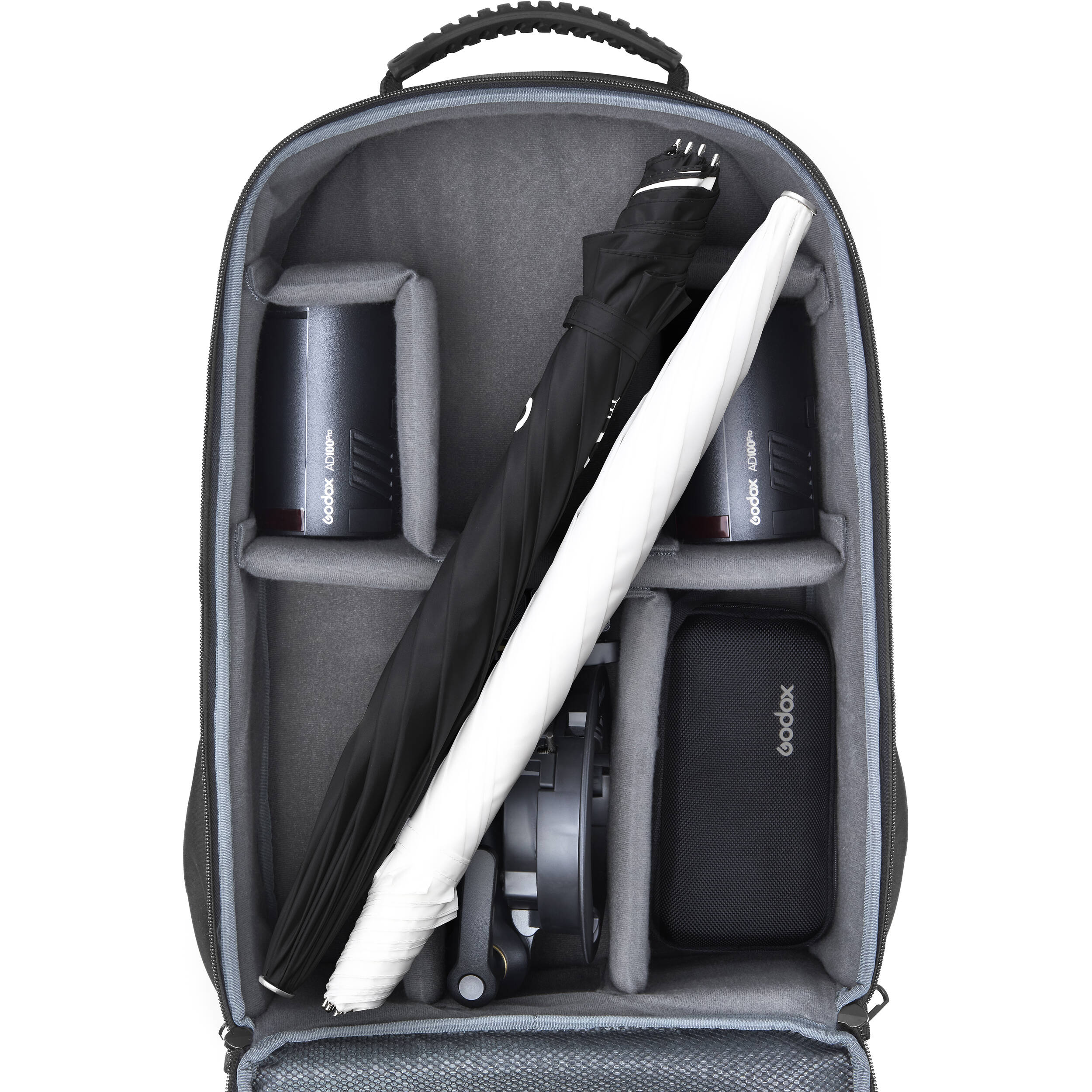 Godox AD100Pro Dual KIT – компактный и легкий комплект для фотографа, чтобы быстро организовать освещение студийного качества на выездной съемке. В базовый комплект входят две аккумуляторные вспышки Godox AD100Pro, два адаптера AD-E2 для установки вспышек на стойку, просветный фотозонт UBL-085T, серебристый фотозонт UBL-085S, адаптер S2 (Bowens) и прочный рюкзак CB20, который вмещает в себя все оборудование. Комплект удобно хранить и просто взять с собой в путешествие.