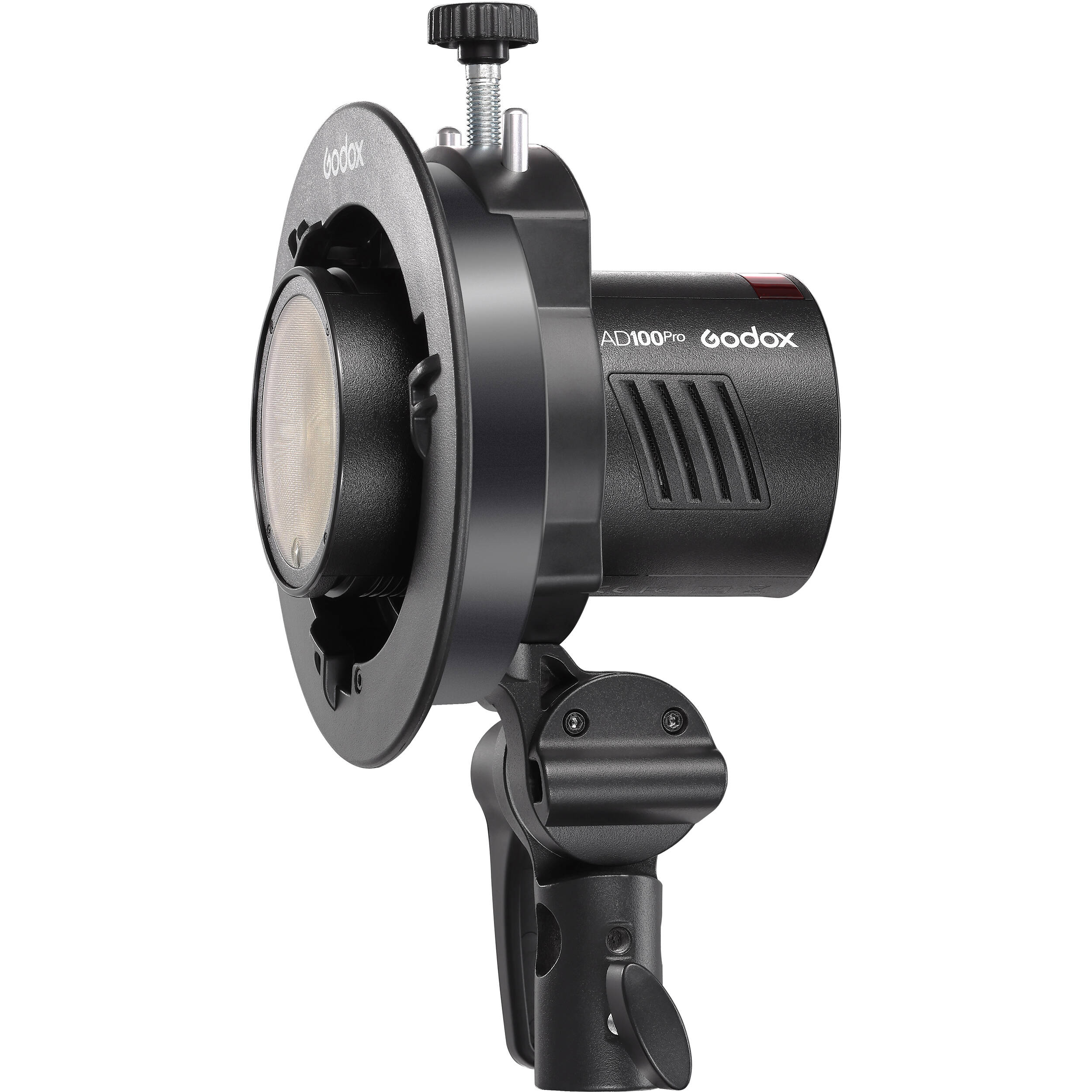 Адаптер S2 (Bowens)позволит раскрыть максимальный потенциал вспышки AD100Pro при работе с сотфбоксами, портретными тарелками, рефлекторами, конусами, фотозонтами и другими дополнительно приобретаемыми светомодификаторами с байонетом Bowens. Кронштейн наклоняется почти на 180°, имеет крепление 5/8" для монтажа на стойке и крепление для установки зонта.