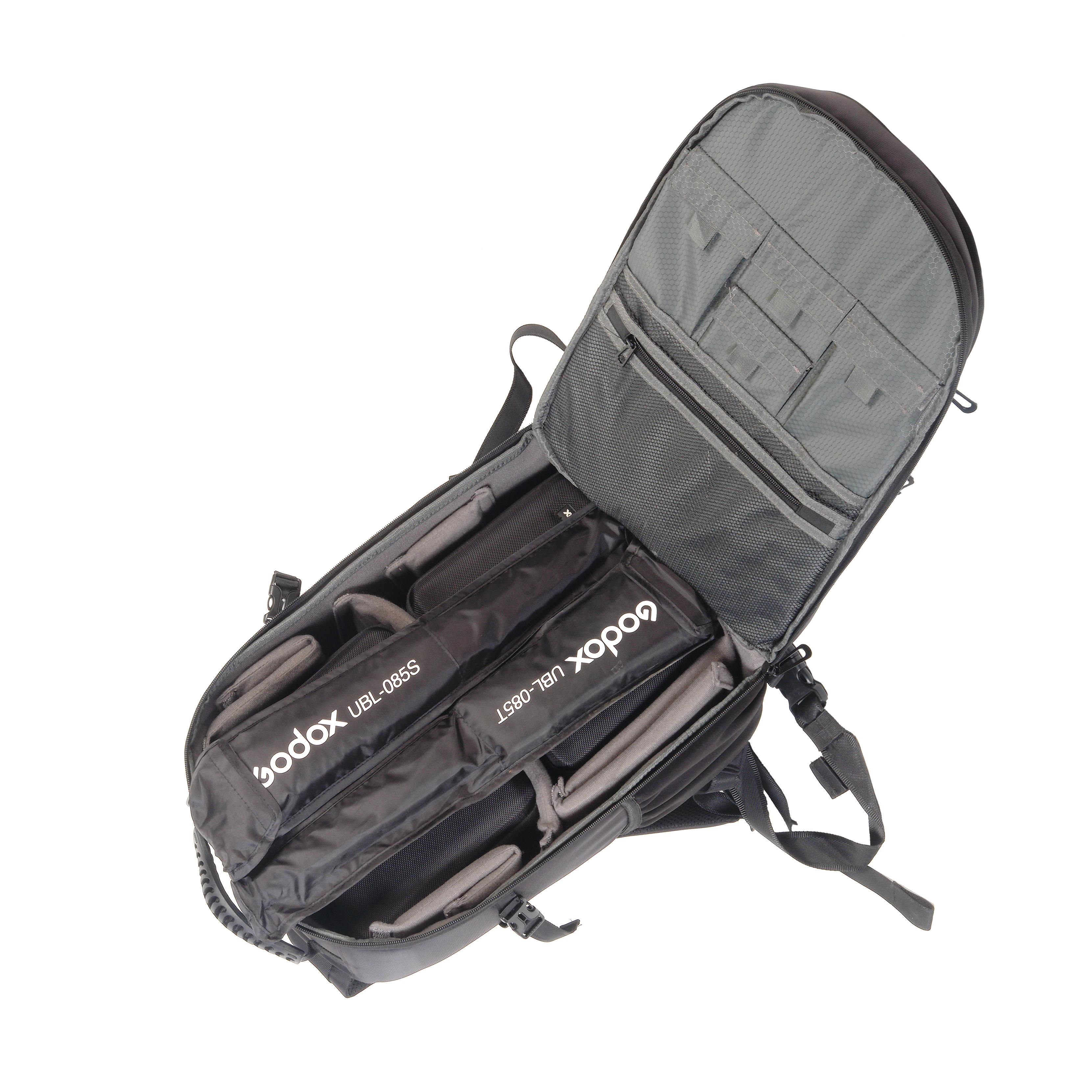 В основном отделении размещены две аккумуляторные вспышки в кофрах и комплектные фотозонты. Для удобства доступа молния с двумя замками расположена по периметру рюкзака. На внутренней стороне крышки находятся четыре кармана и сетчатое отделение для хранения дополнительных аксессуаров. В дополнительное отделение на молнии помещается комплектный софтбокс.
