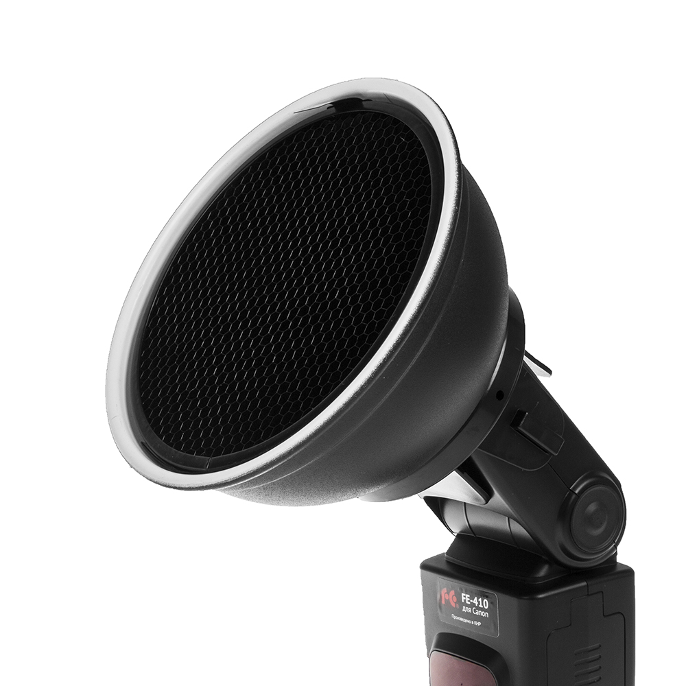 - коническая насадка, изготовлена из металла, длина 145 мм, диаметр выходного отверстия 40 мм, в комплекте две сотовые насадки с размером ячеек 2 мм и 3 мм: используя вспышку вне камеры, комплект позволит создать выразительный световой акцент на объекте съемки.