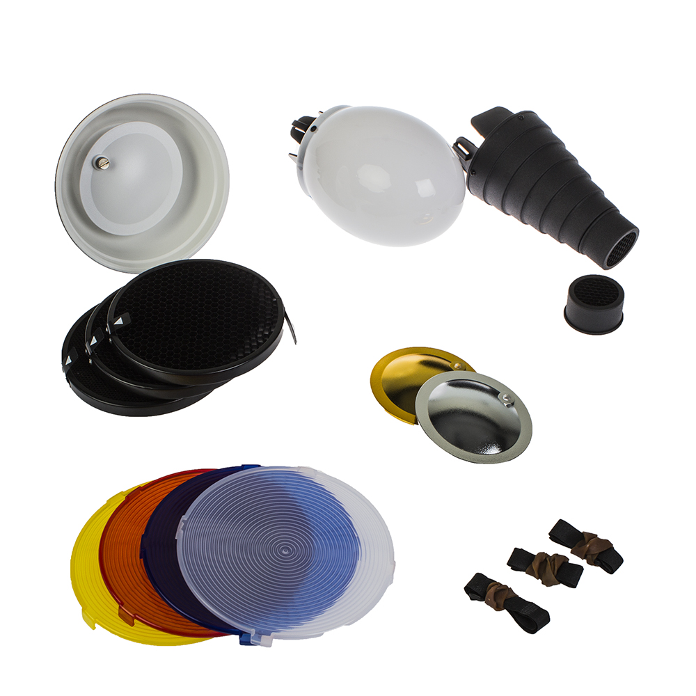 - сферический рассеиватель, изготовлен из пластика, размер 120×140 мм: обеспечивает мягкий и равномерный свет, используется для создания заполняющего освещения, широко используется в интерьерной съемке.